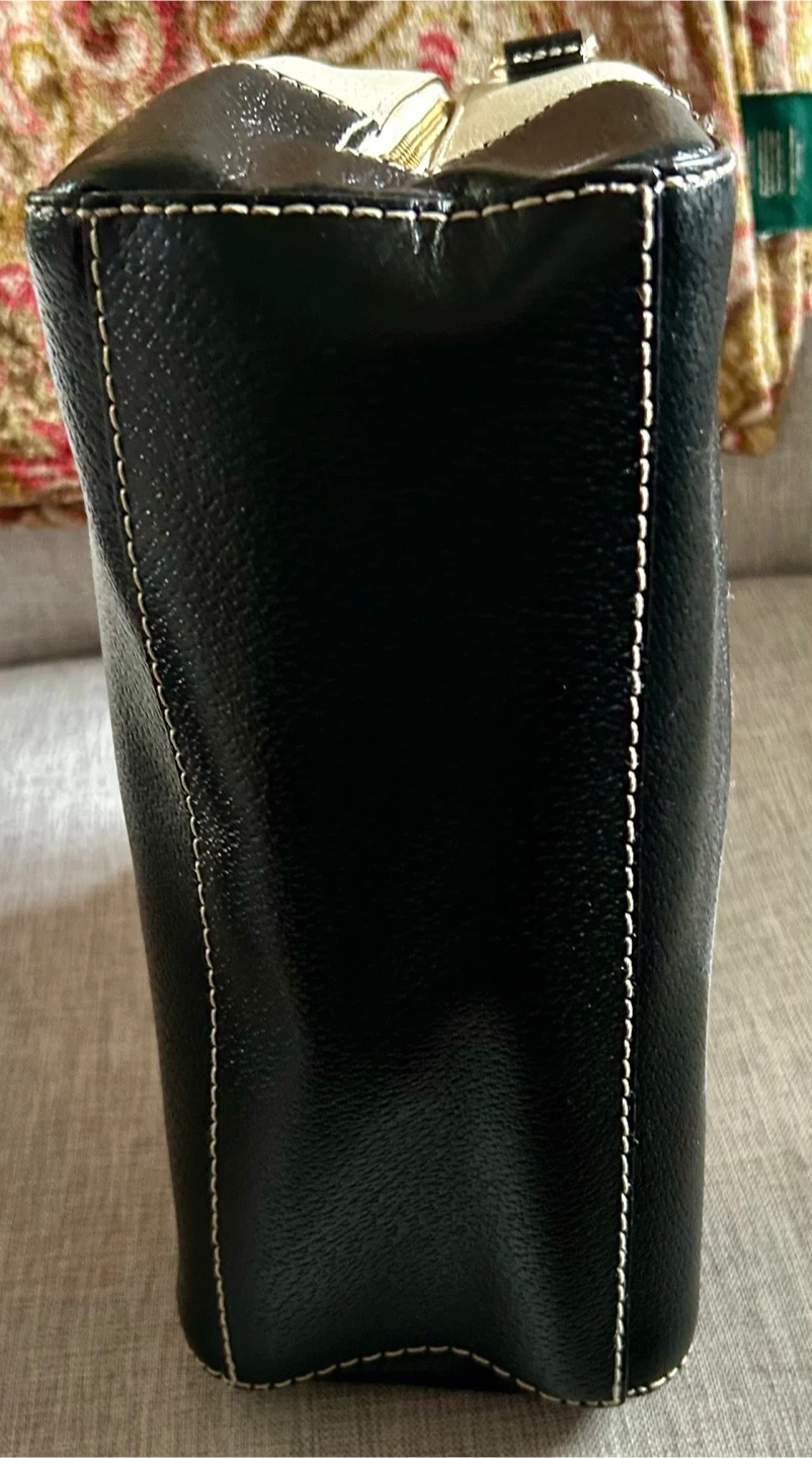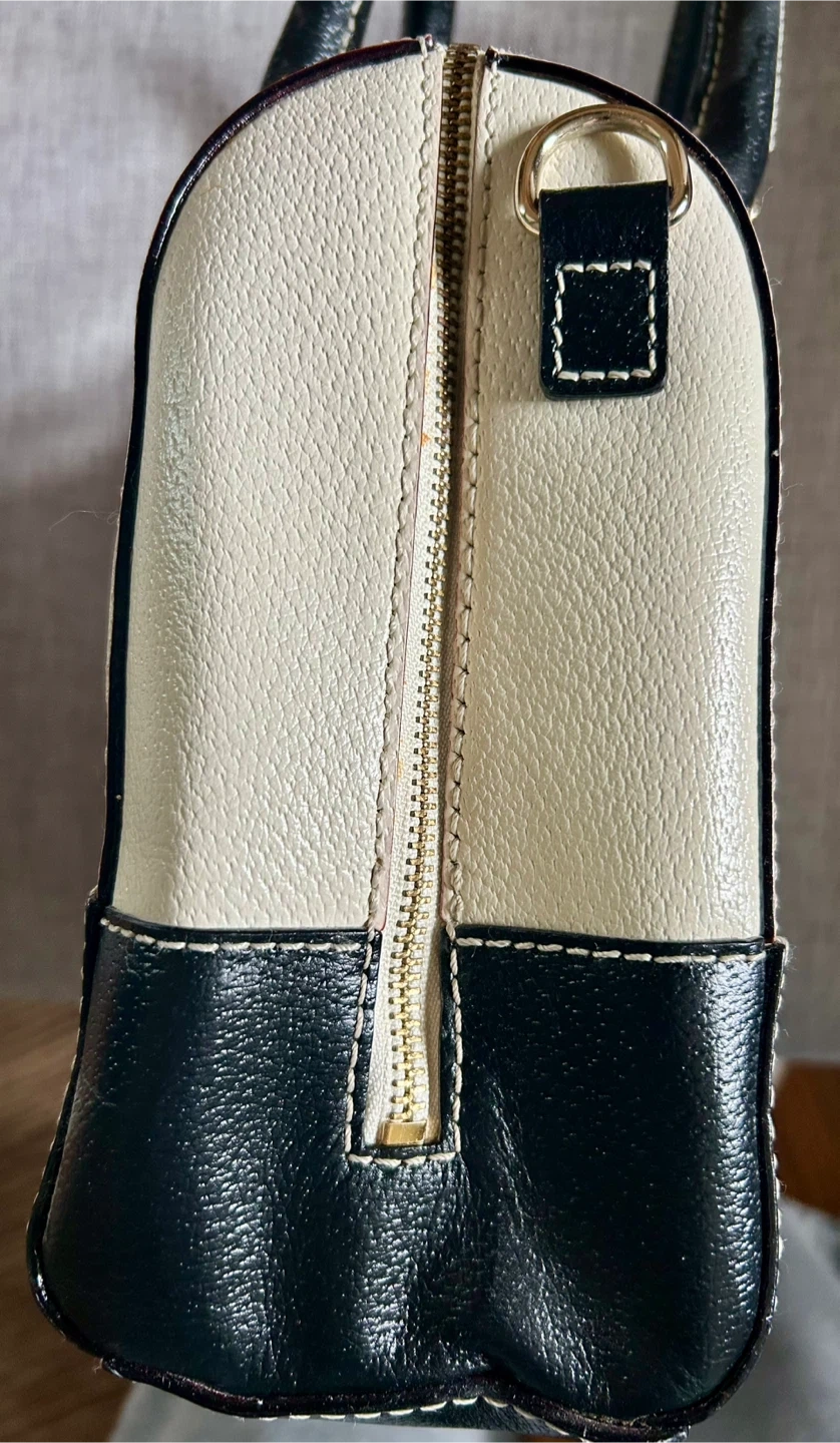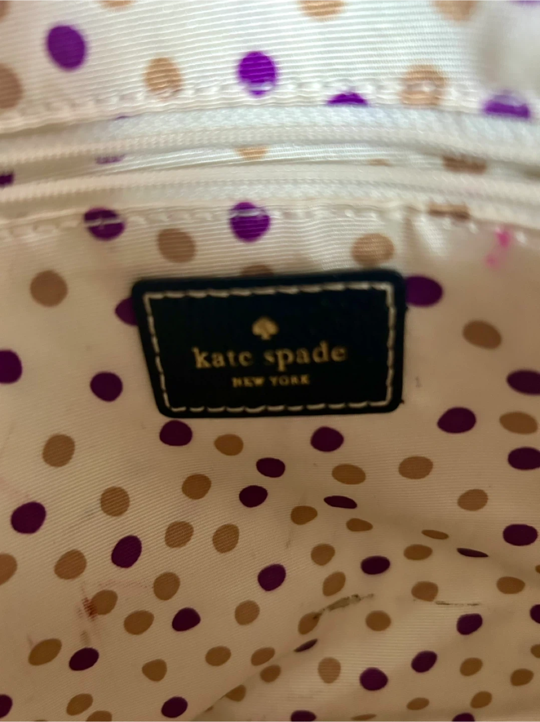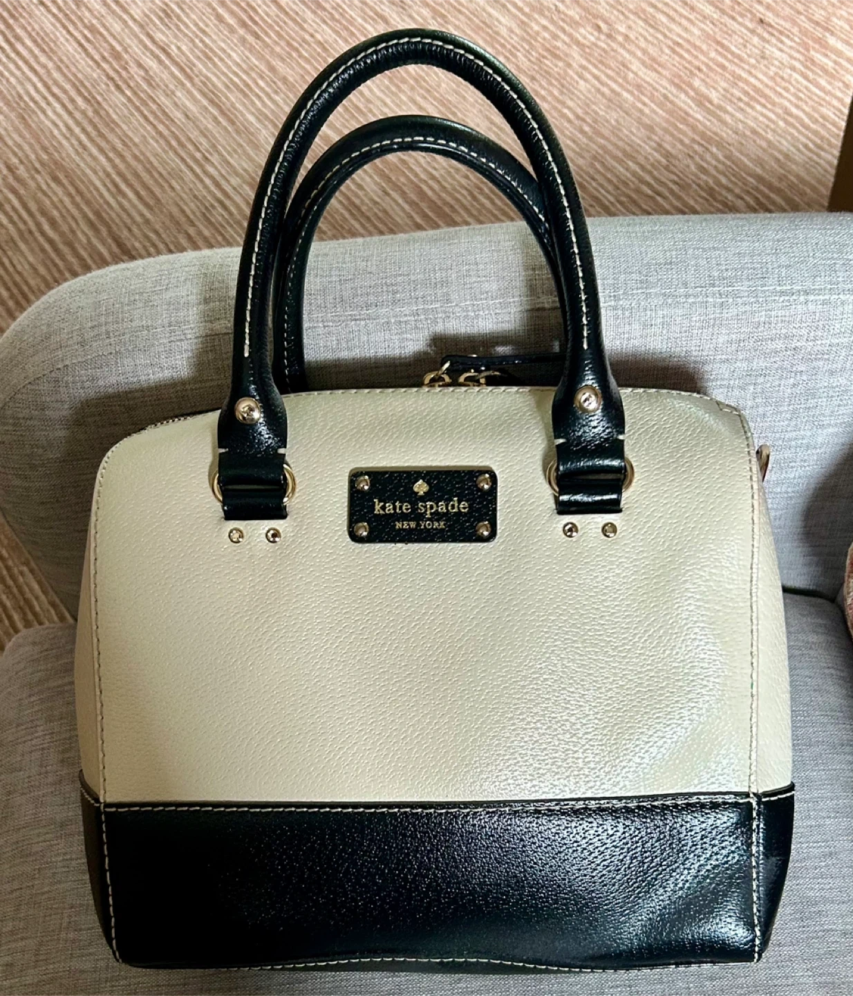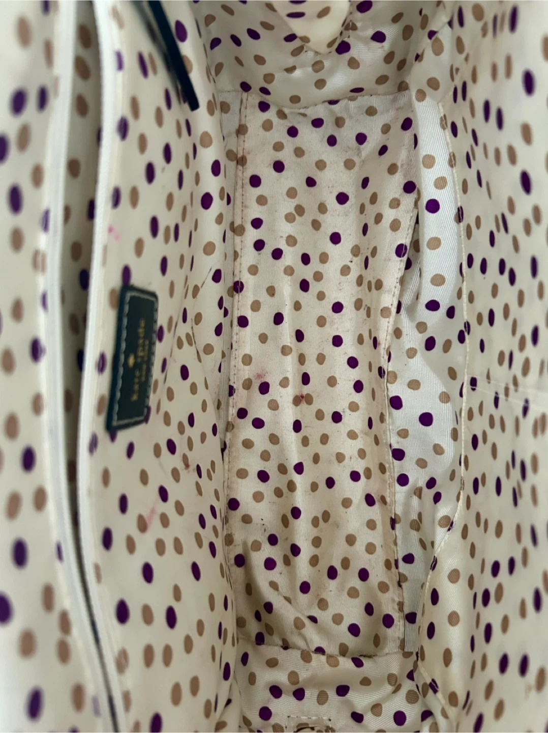 Selling a Kate Spade satchel bag in cream and black. It's in great condition and perfect for everyday use. The bag features a zip closure and has handles for easy carrying. A stylish and practical accessory!
