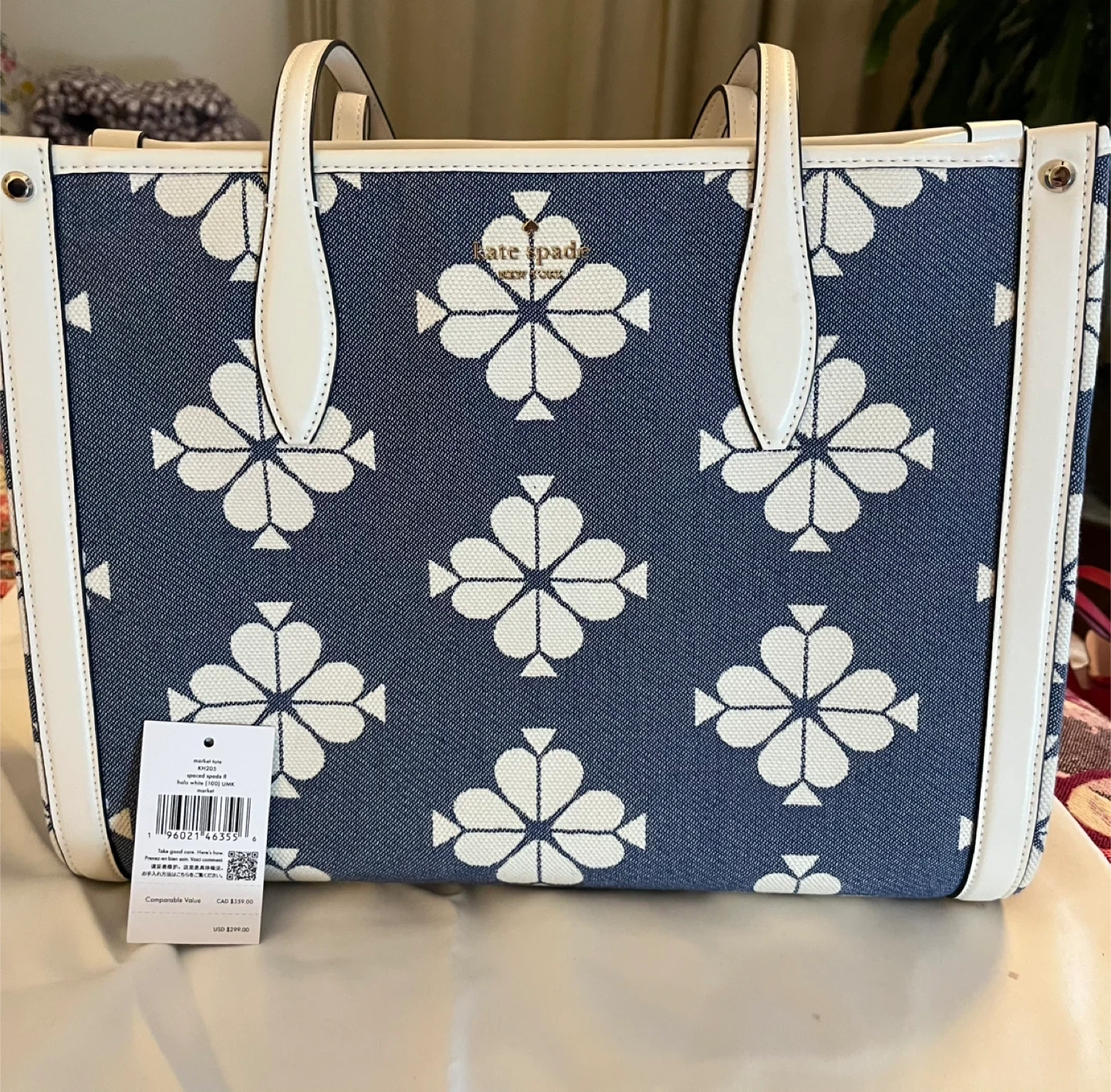 Selling a Kate Spade tote bag with a spaced spade pattern in kalo white & denim blue color. The tag shows a comparable value of CAD $359.00 and USD $299.00