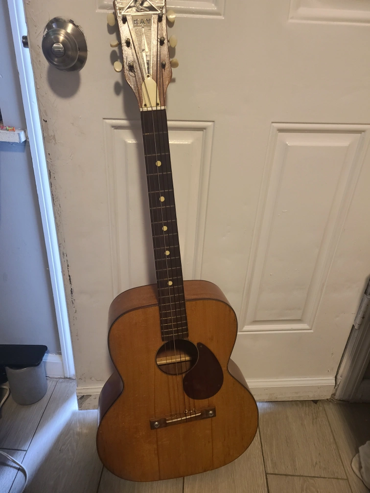 Selling a Kay acoustic guitar. It has a vintage look and feel. Perfect for someone looking for a classic instrument to play or collect. It's in used condition, but still has plenty of life left in it!