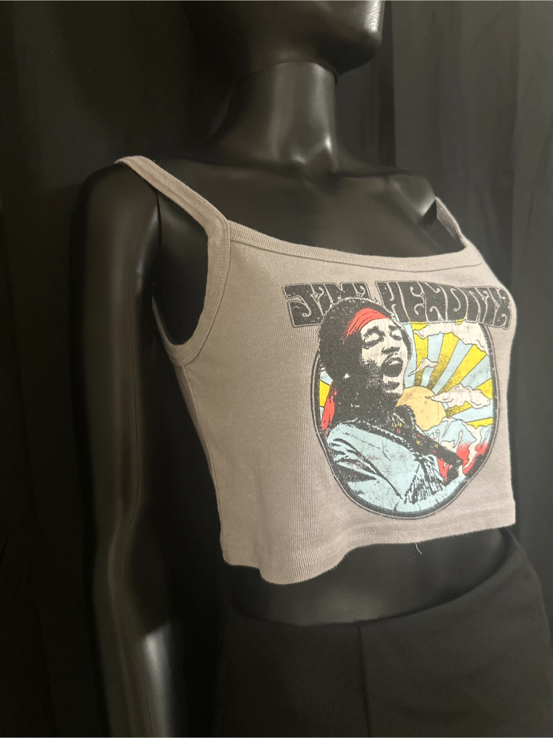 Gray ribbed crop tank top featuring a graphic print of Jimi Hendrix. It's a stylish piece for any music fan. Made from a comfortable, stretchy fabric.