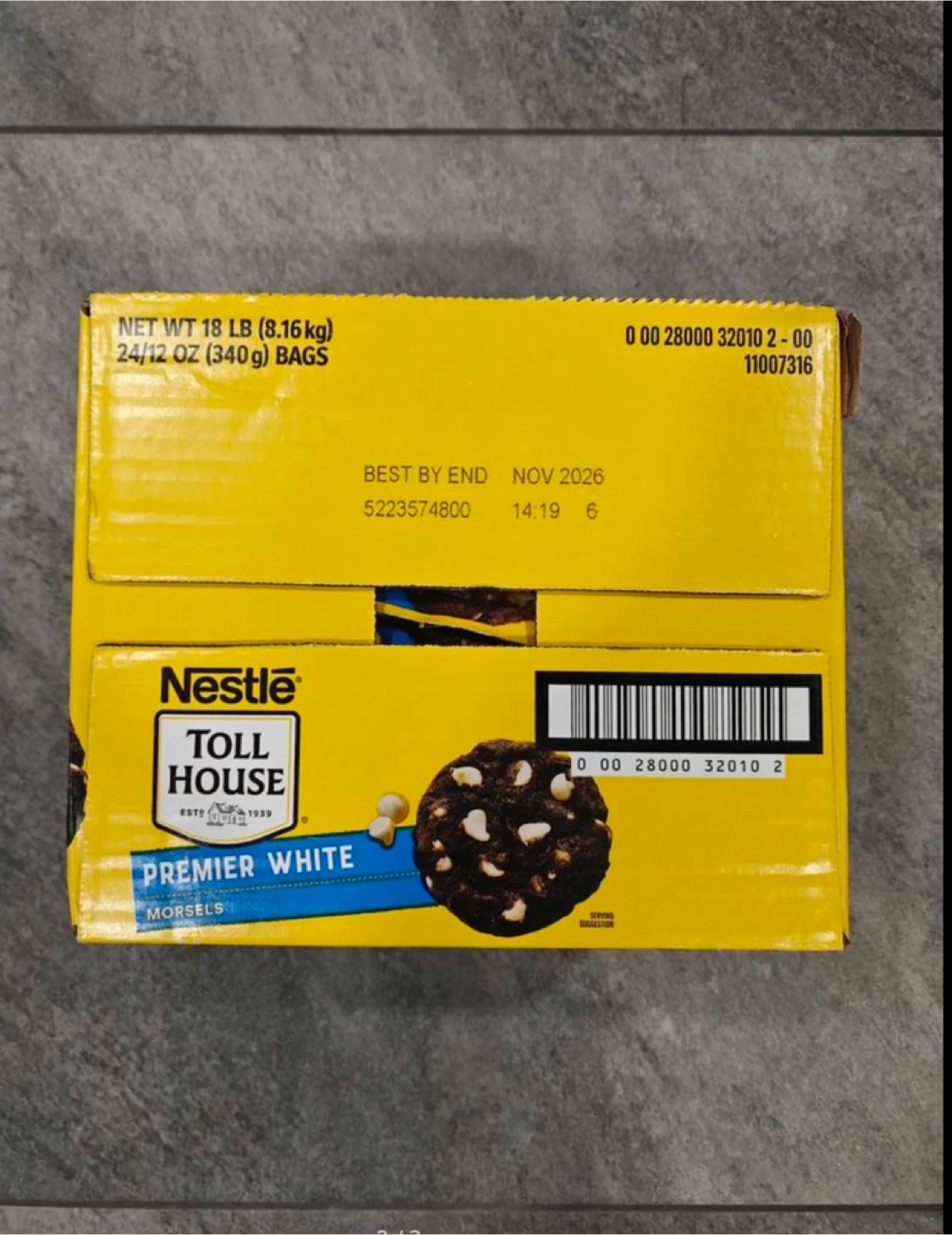 Selling a box of Nestle Toll House Premier White Morsels. These morsels are perfect for baking your favorite cookies and treats! They are premier white morsels and the best by end date is November 2026