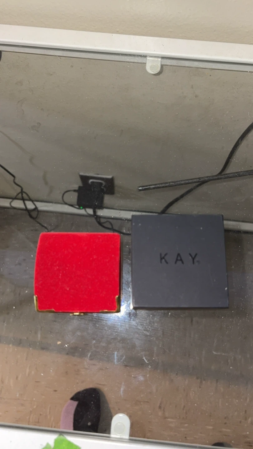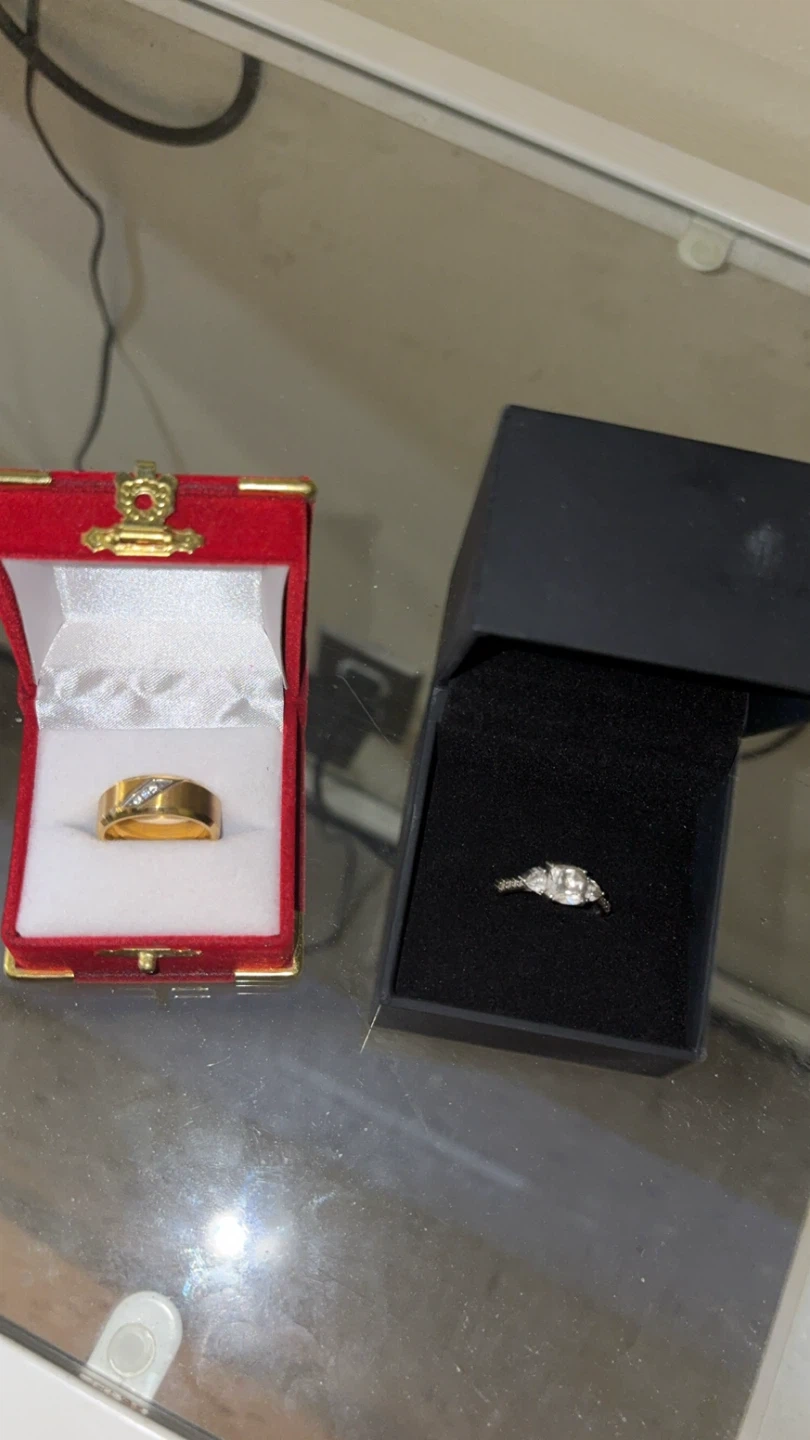 Set includes a 10k gold wedding band with small diamonds and a separate engagement ring with three larger stones. Comes with Kay Jewelers packaging.