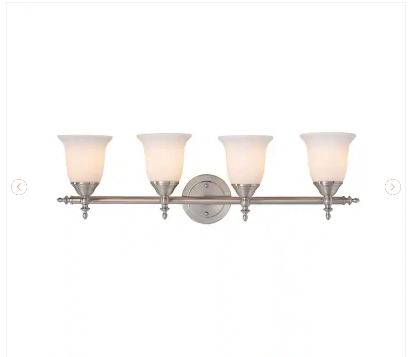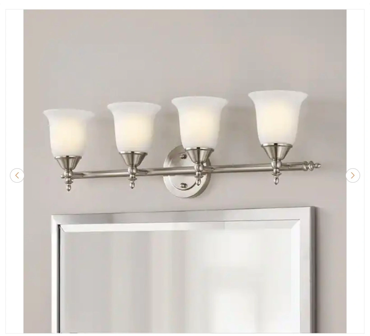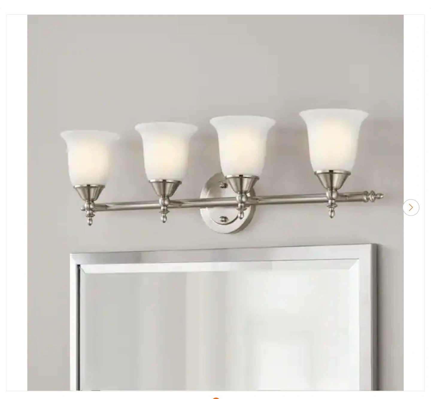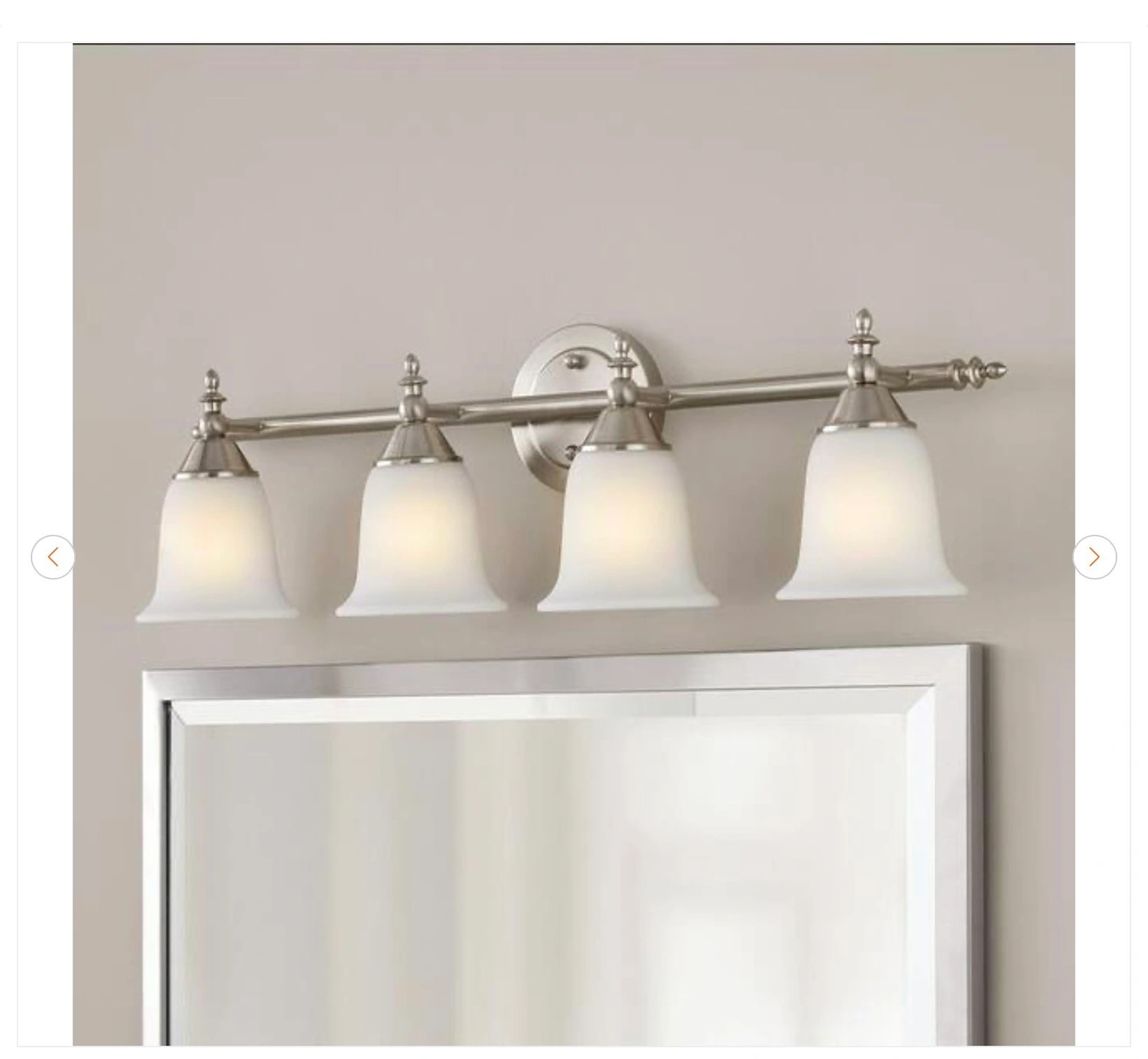Brand new Hampton Bay Olgelthorpe 29.8 in. 4-Light Brushed Nickel Bathroom Vanity Light Fixture with Bell Shaped Frosted Glass Shades. Feel free to message if you have any questions!