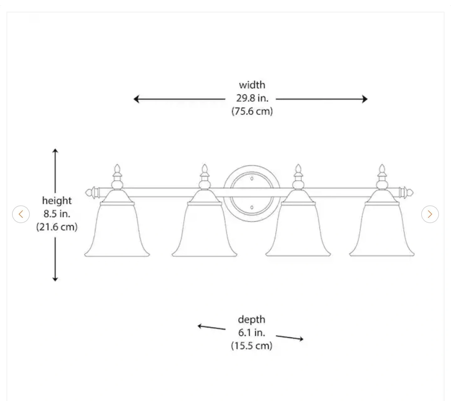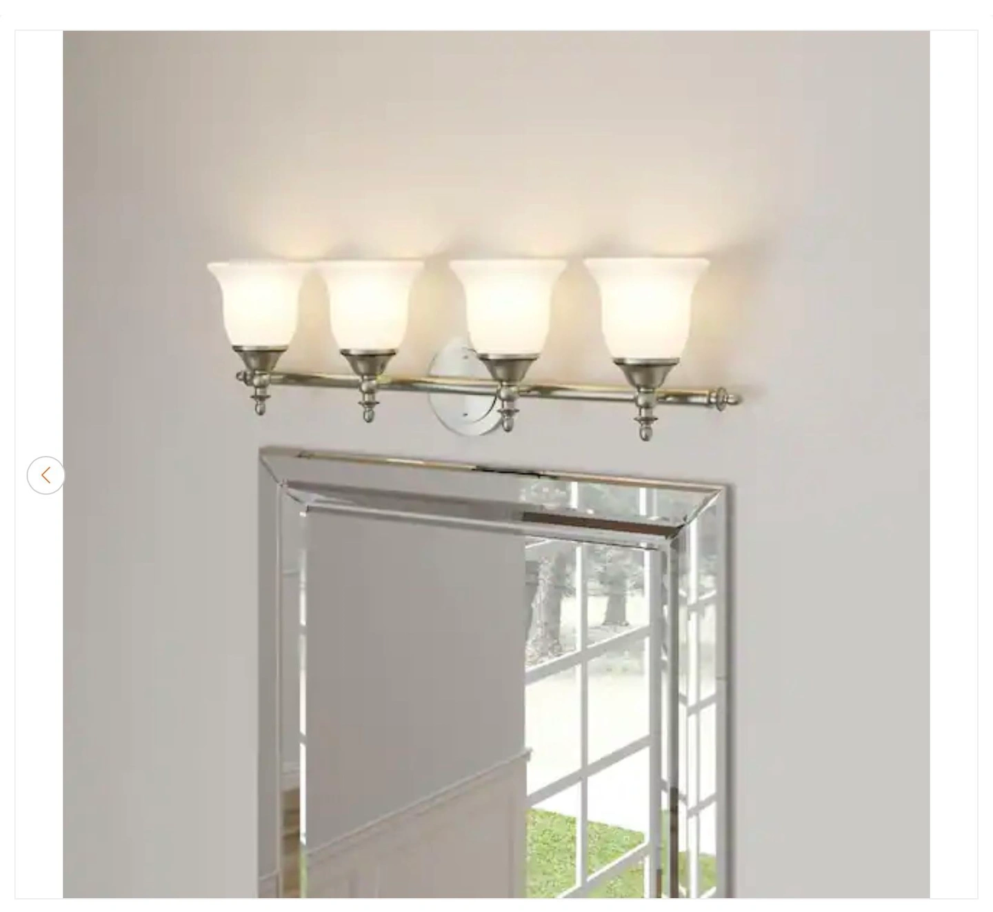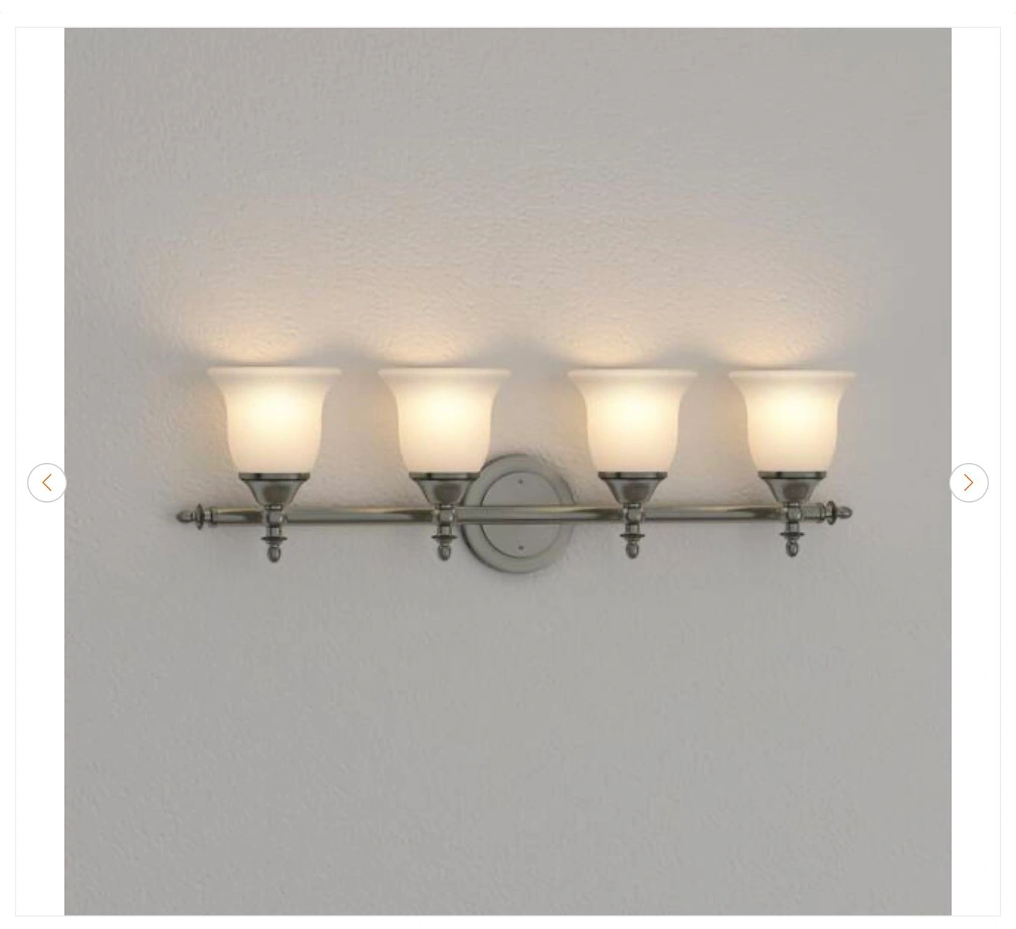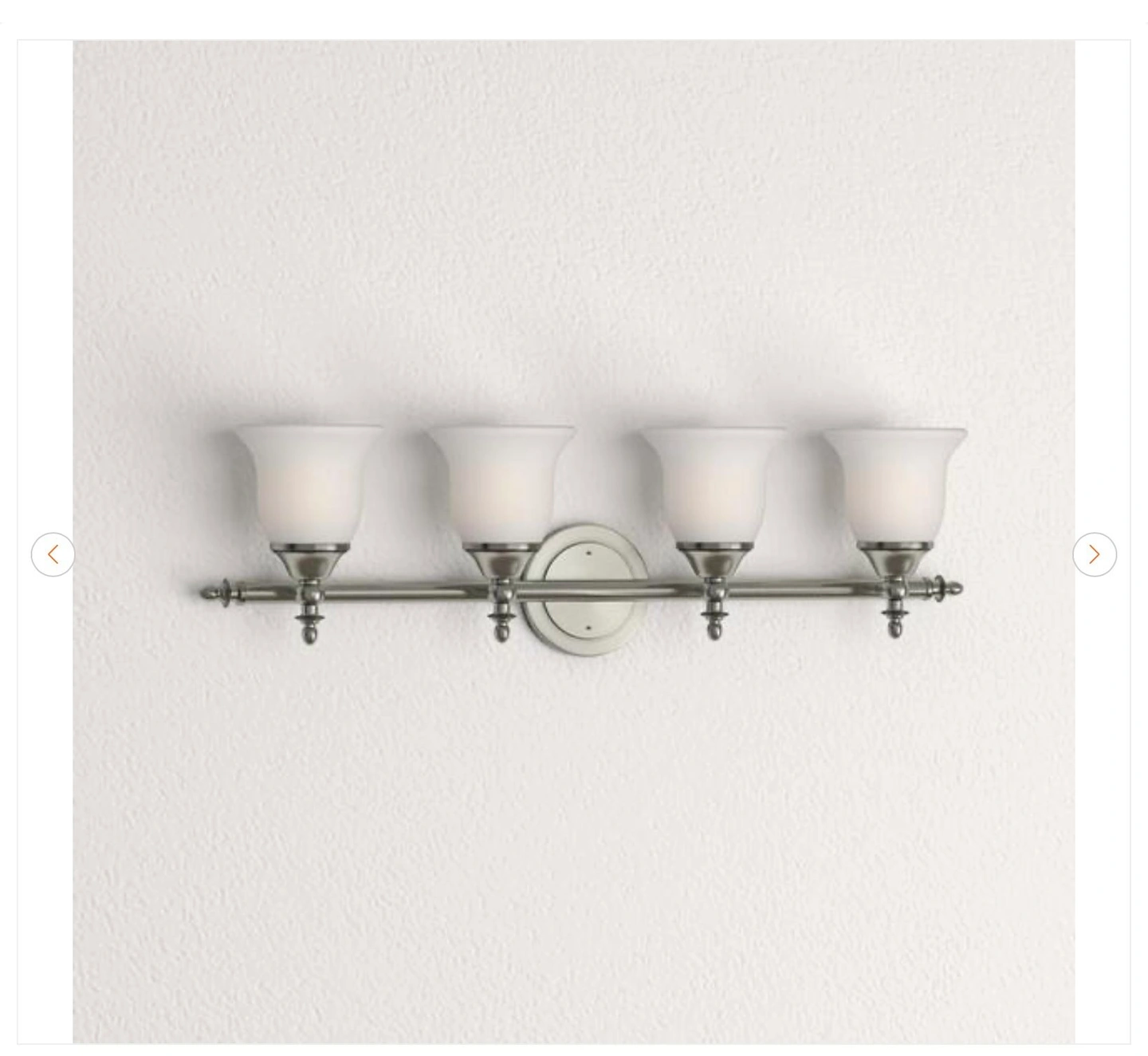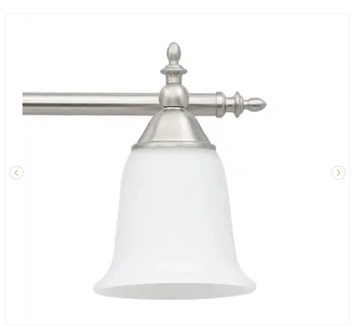 Brand new Hampton Bay Olgelthorpe 29.8 in. 4-Light Brushed Nickel Bathroom Vanity Light Fixture with Bell Shaped Frosted Glass Shades. Feel free to message if you have any questions!