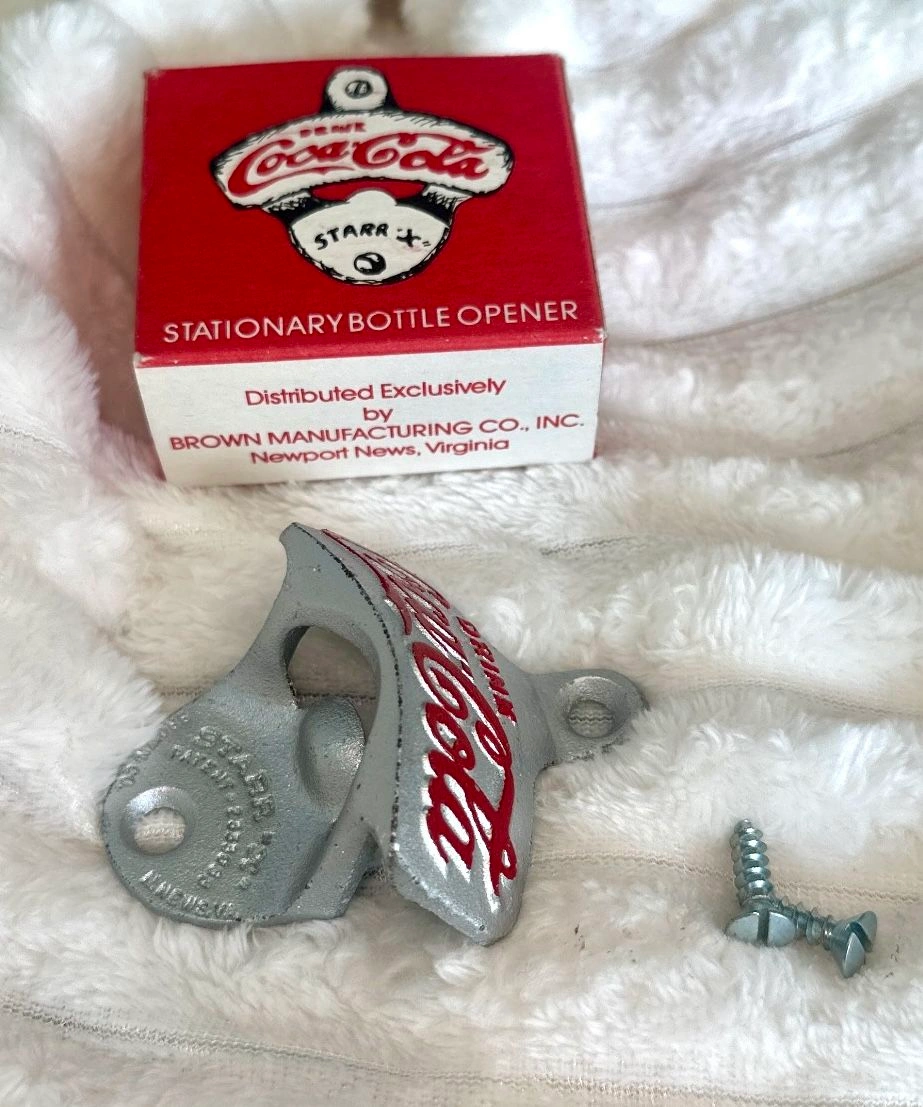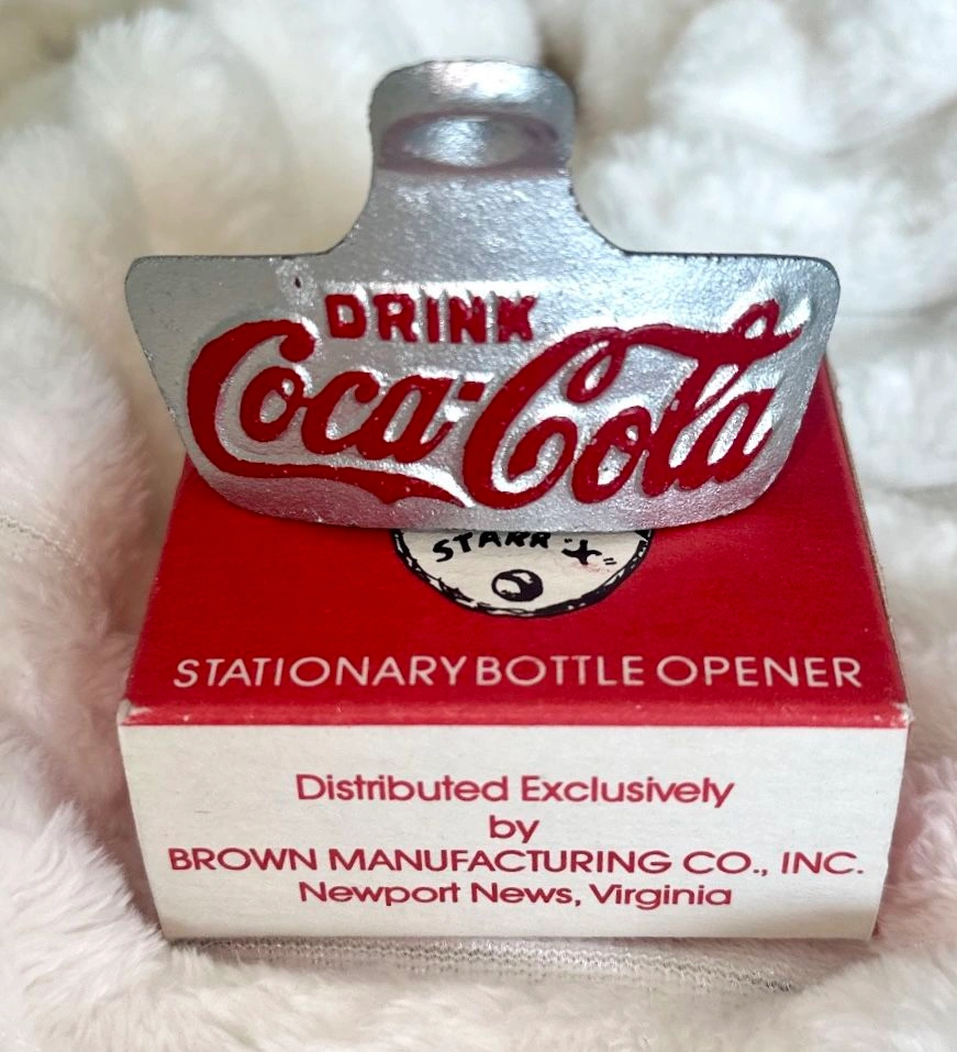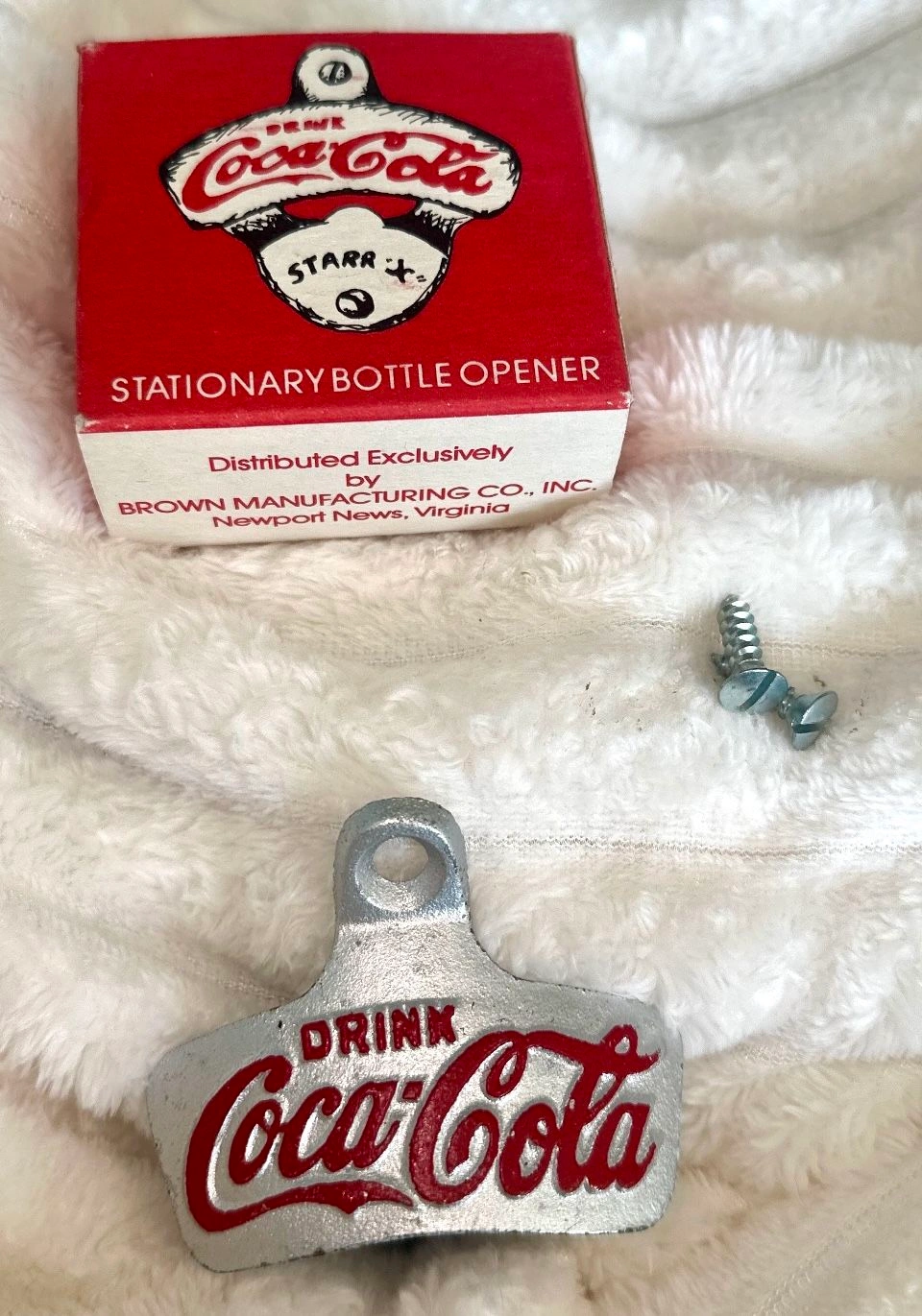 This is a vintage Coca-Cola Starr X stationary bottle opener, manufactured by the Brown Manufacturing Company in Newport News, Virginia, for the Coca-Cola Bottling Company. These were made between 1929 and 1970. It's in unused condition and comes with the original box and two mounting screws. The box is in excellent condition. This is a collectible piece, perfect for Coca-Cola enthusiasts. It's designed for easy wall mounting and is made of sturdy metal. Features the classic 'Drink Coca-Cola' logo and 'STARR X' branding. Buyer must pick up from the Morton Grove area. Cash only.