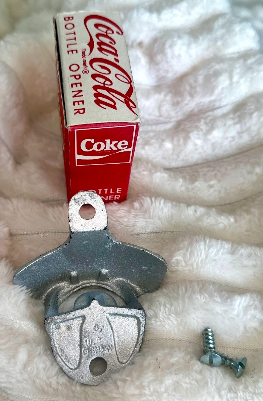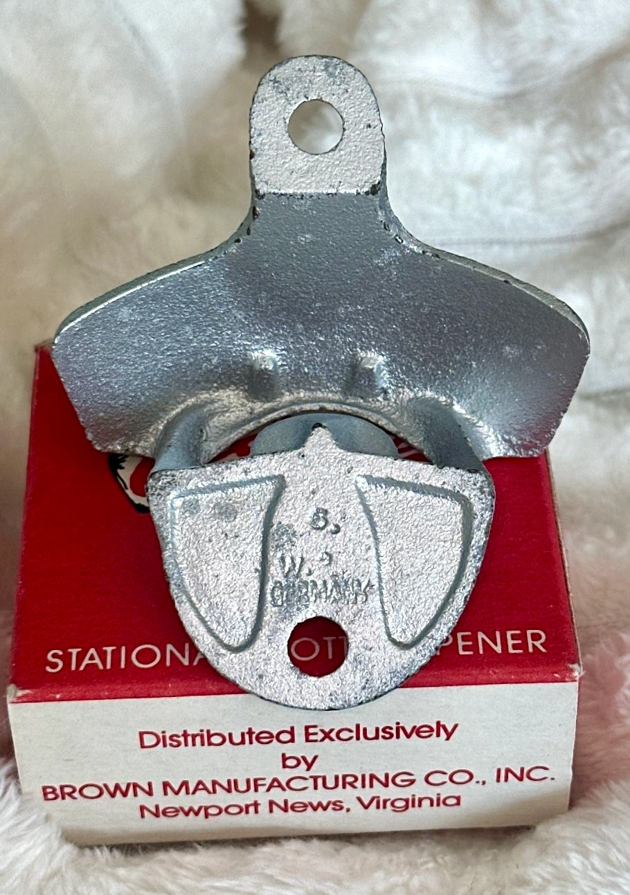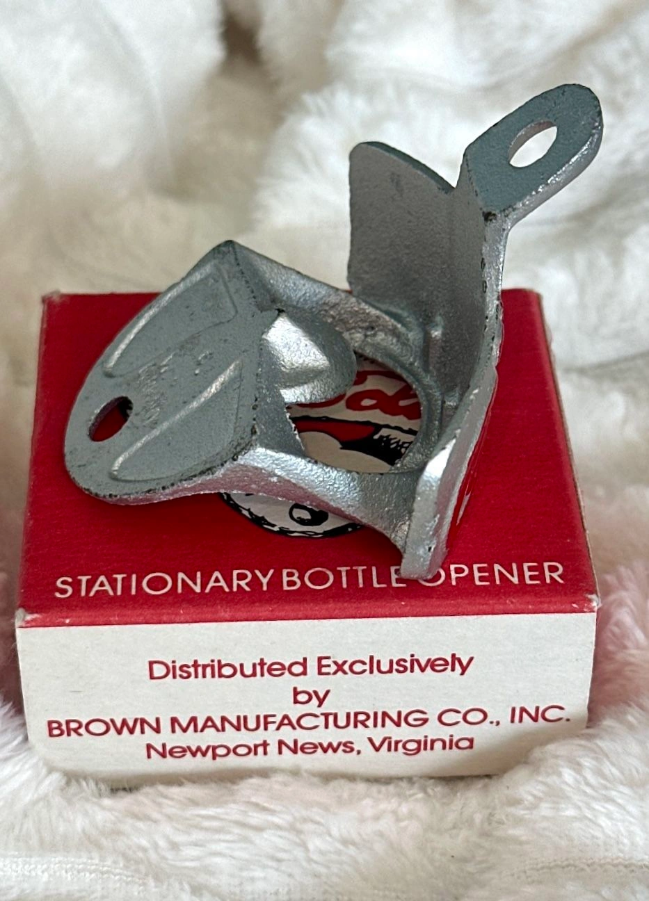 This is a vintage Coca-Cola Starr X stationary bottle opener, manufactured by the Brown Manufacturing Company in Newport News, Virginia, for the Coca-Cola Bottling Company. These were made between 1929 and 1970. It's in unused condition and comes with the original box and two mounting screws. The box is in excellent condition. This is a collectible piece, perfect for Coca-Cola enthusiasts. It's designed for easy wall mounting and is made of sturdy metal. Features the classic 'Drink Coca-Cola' logo and 'STARR X' branding. Buyer must pick up from the Morton Grove area. Cash only.