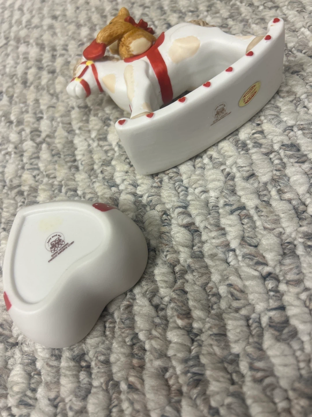 I'm selling two Enesco Precious Moments figurines. One is a teddy bear on a heart and the other is a teddy bear on a rocking horse. They are in great condition!