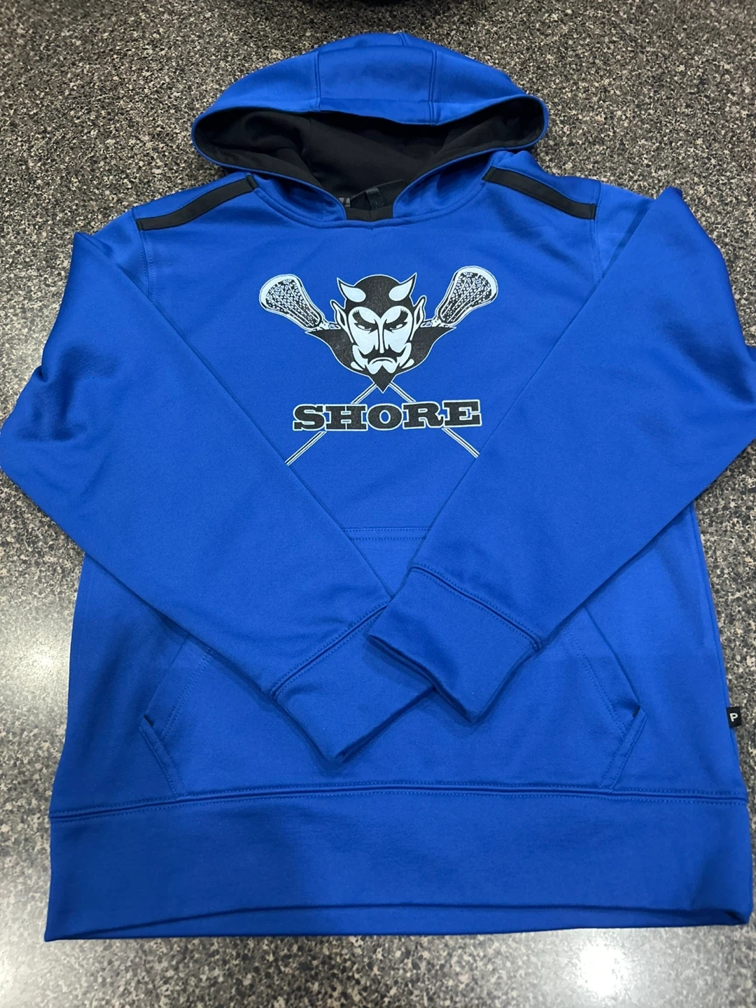 Selling a blue Shore lacrosse hoodie. It features a devil head with lacrosse sticks. The hoodie has a black interior hood and black shoulder stripes. It is in good condition and ready for a new owner