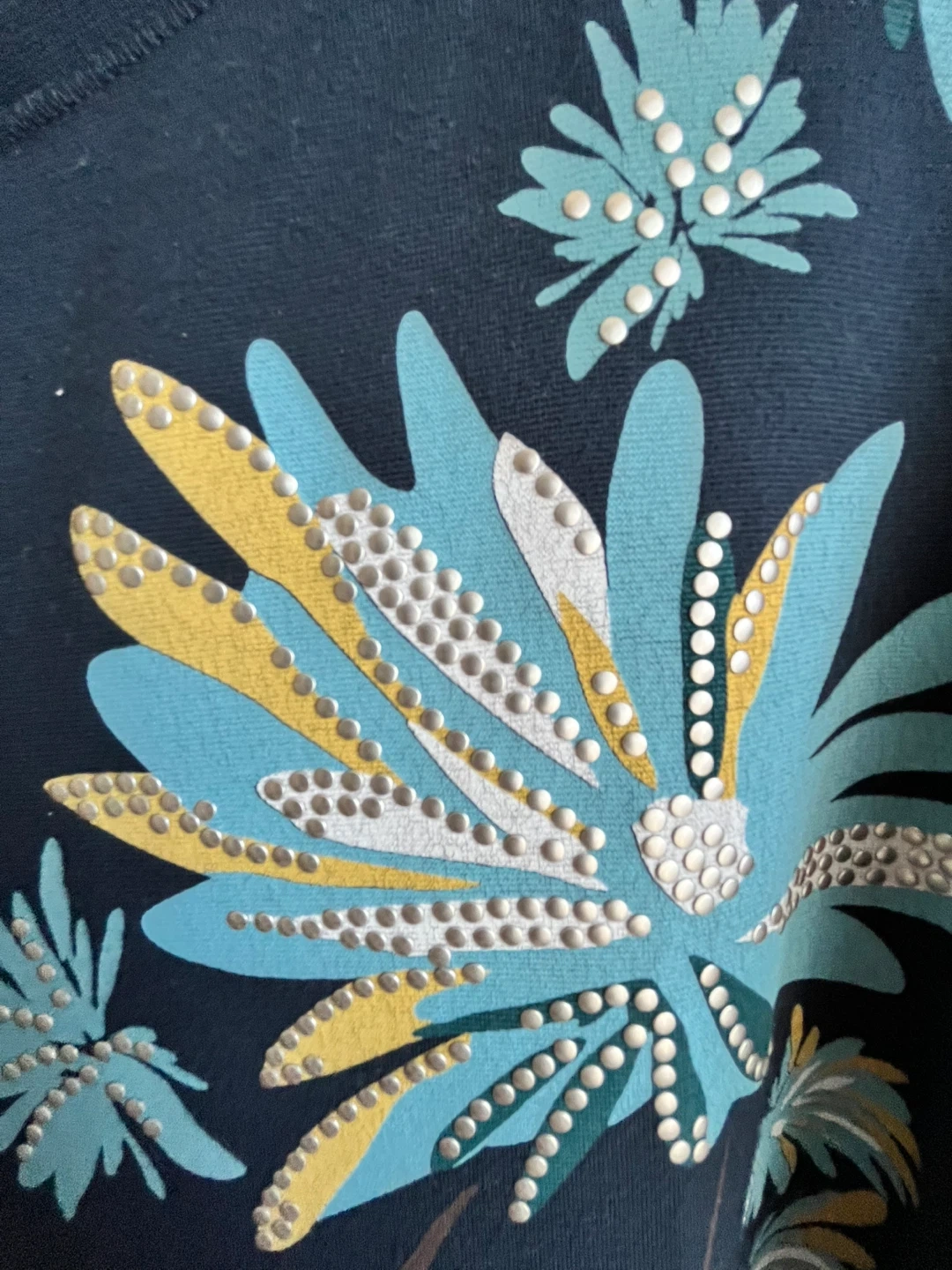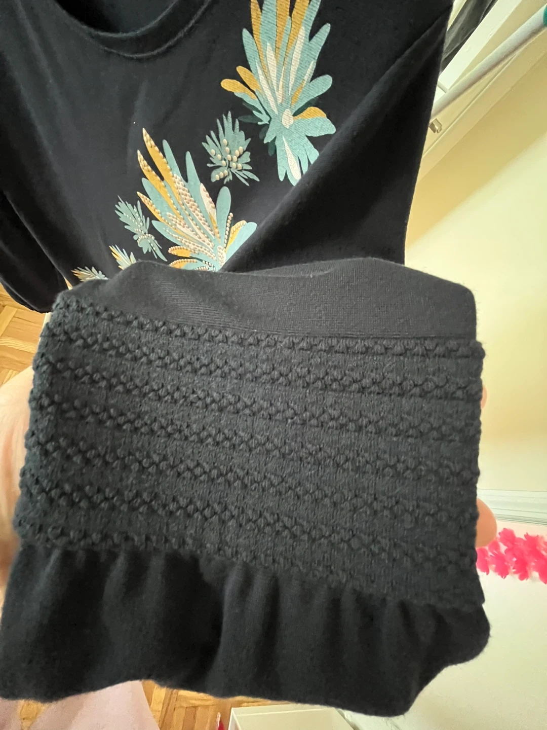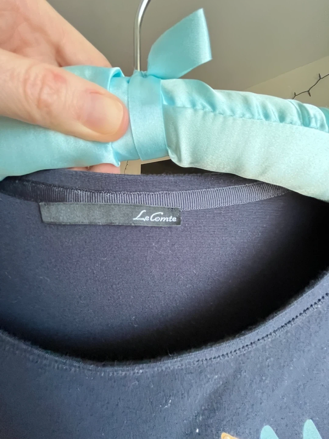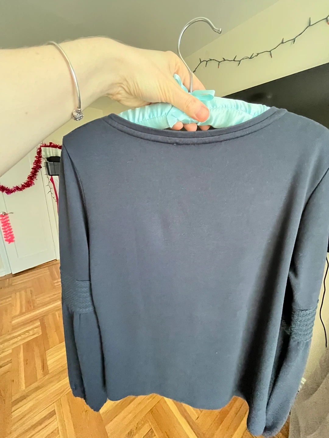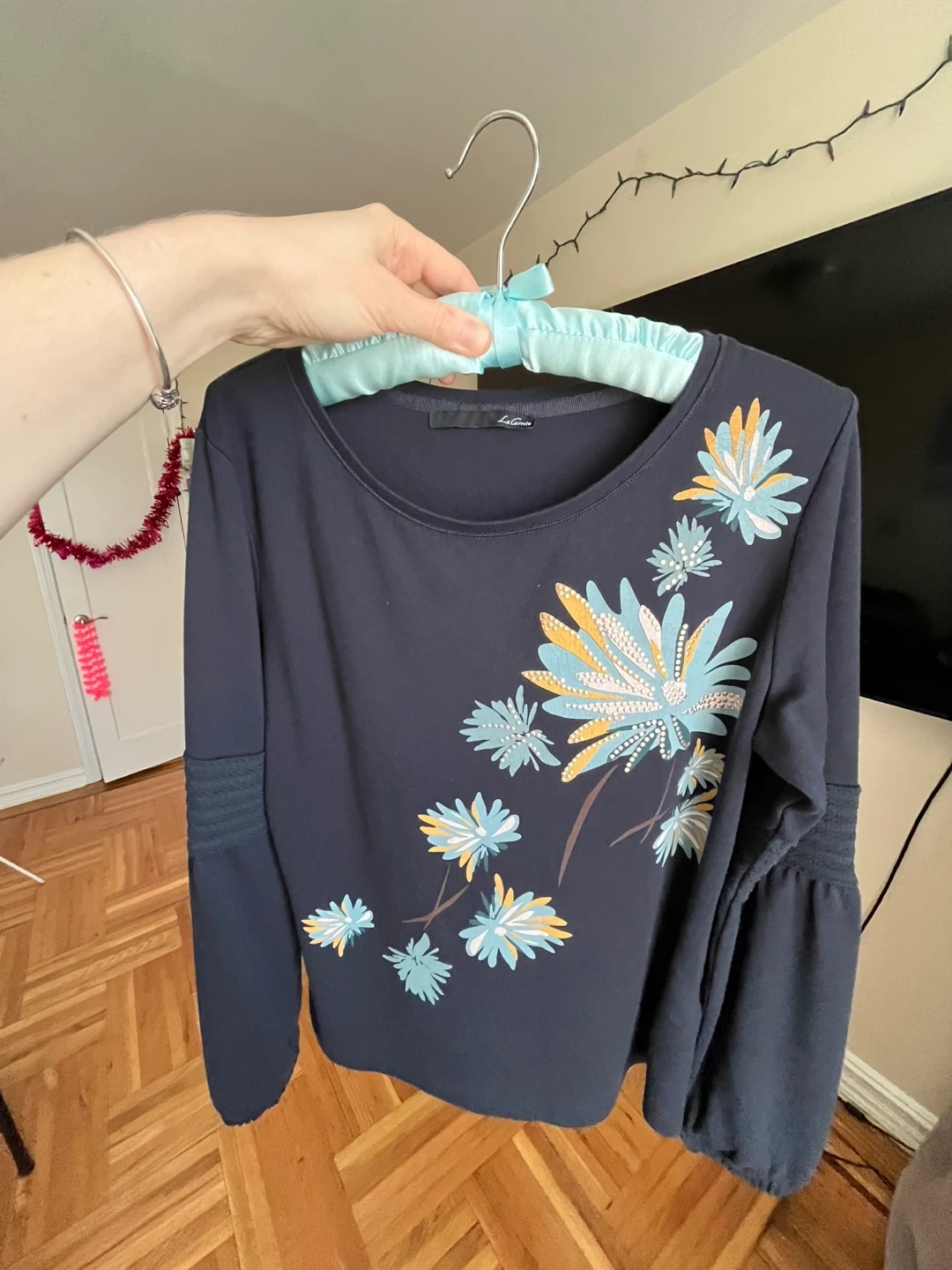 This long-sleeve top from Le Comte features a navy blue base with a colorful floral design on the front. The sleeves have a textured detail and gently balloon towards the cuff. It's made from a soft fabric. Türkiye. Italian brand. Worn once. Thick fabric. Ideal for a small size. But also fits a medium.