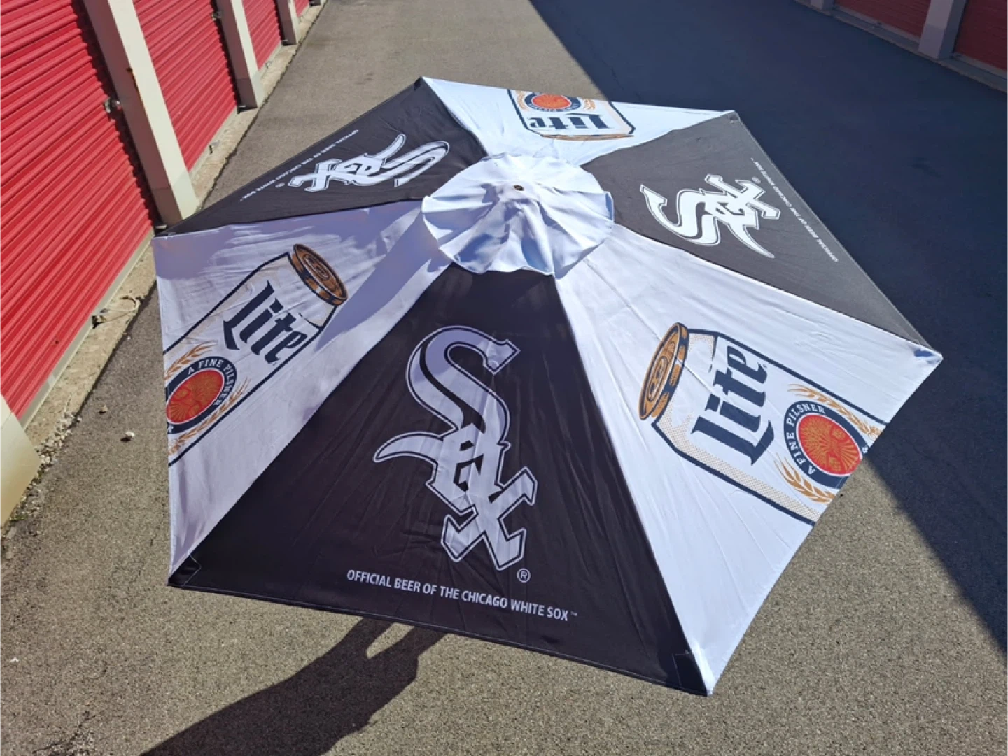 This is a Miller Lite and Chicago White Sox umbrella. It features logos from both brands. Great for outdoor events or shade.