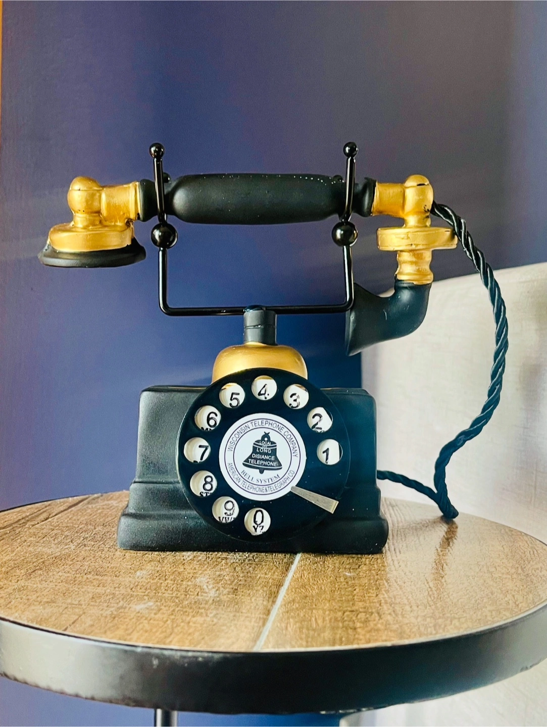 Selling a vintage-style rotary telephone from Telephone Company! It has a classic black and gold design. Perfect as a decorative piece or for adding a retro touch to your home
