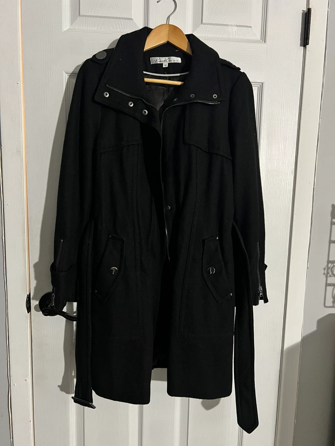 60Kenneth Cole black wool blend coat in size 12. It's in great condition and features a stylish design with a belted waist. Perfect for keeping warm this season!