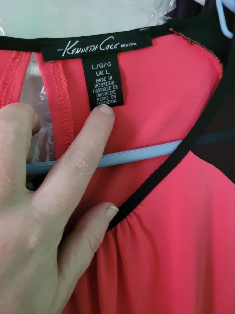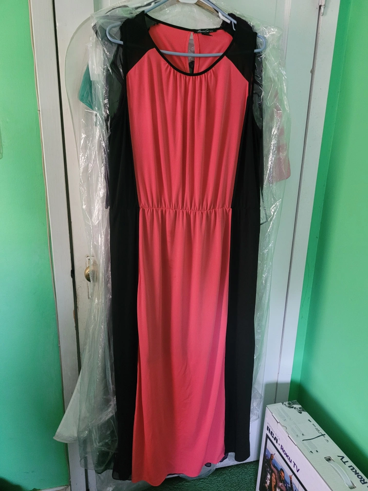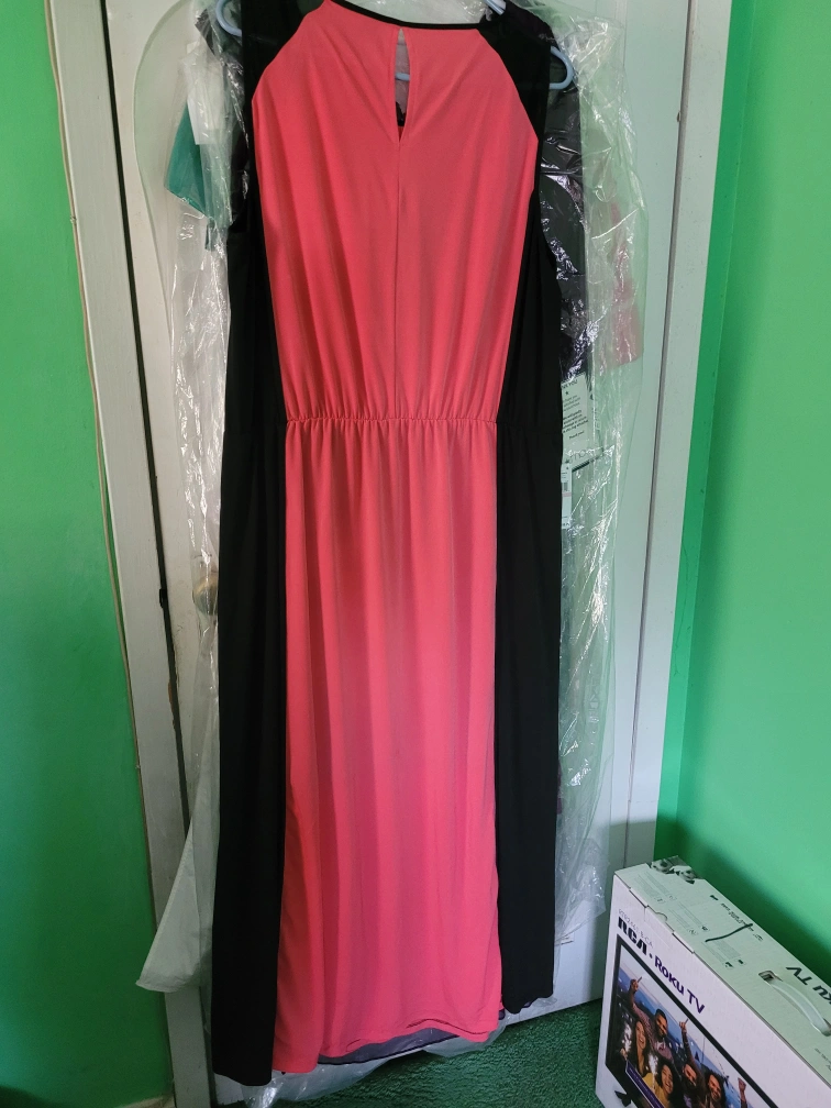 Selling a Kenneth Cole New York dress in size L. The dress features a color block design with coral and black. It's in great condition and ready for a new home