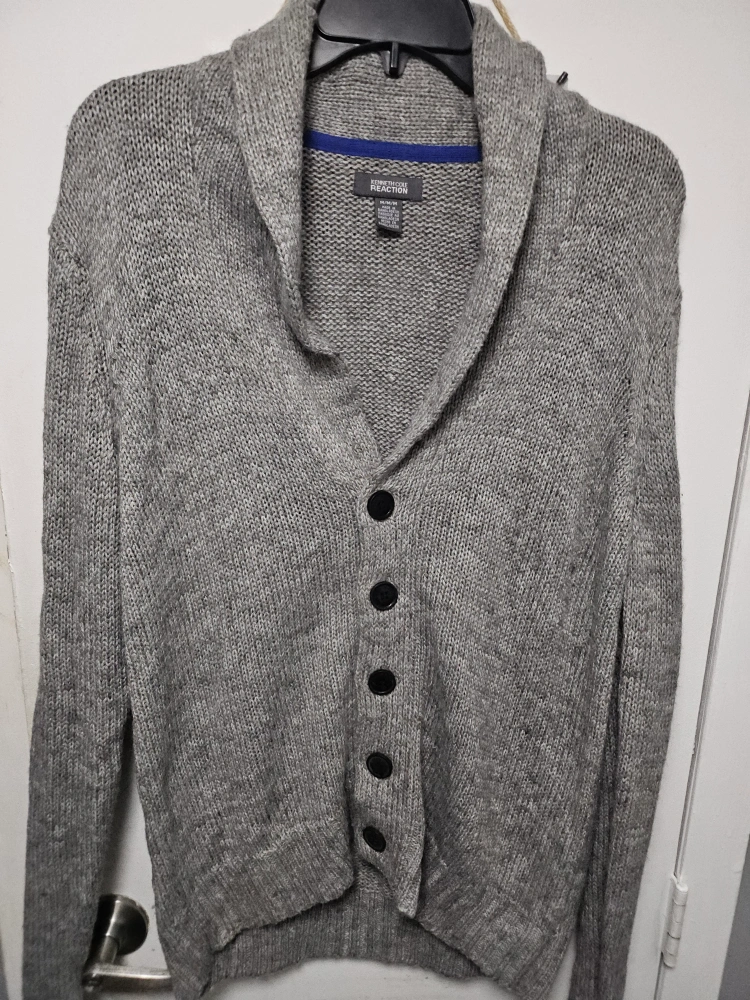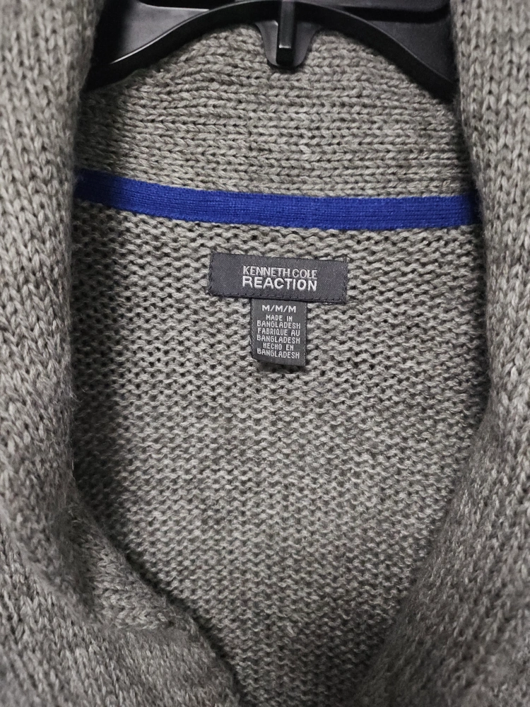 24Selling a Kenneth Cole Reaction cardigan in size M. It's a stylish gray color and made in Bangladesh. Perfect for layering!