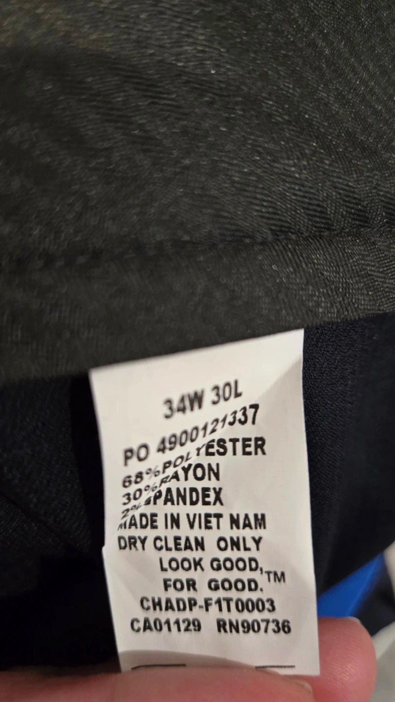 99Selling a pair of men's dress pants in size 34W 30L. The material is 68% polyester, 30% rayon, and 2% spandex. They're in great condition and ready for a new home!