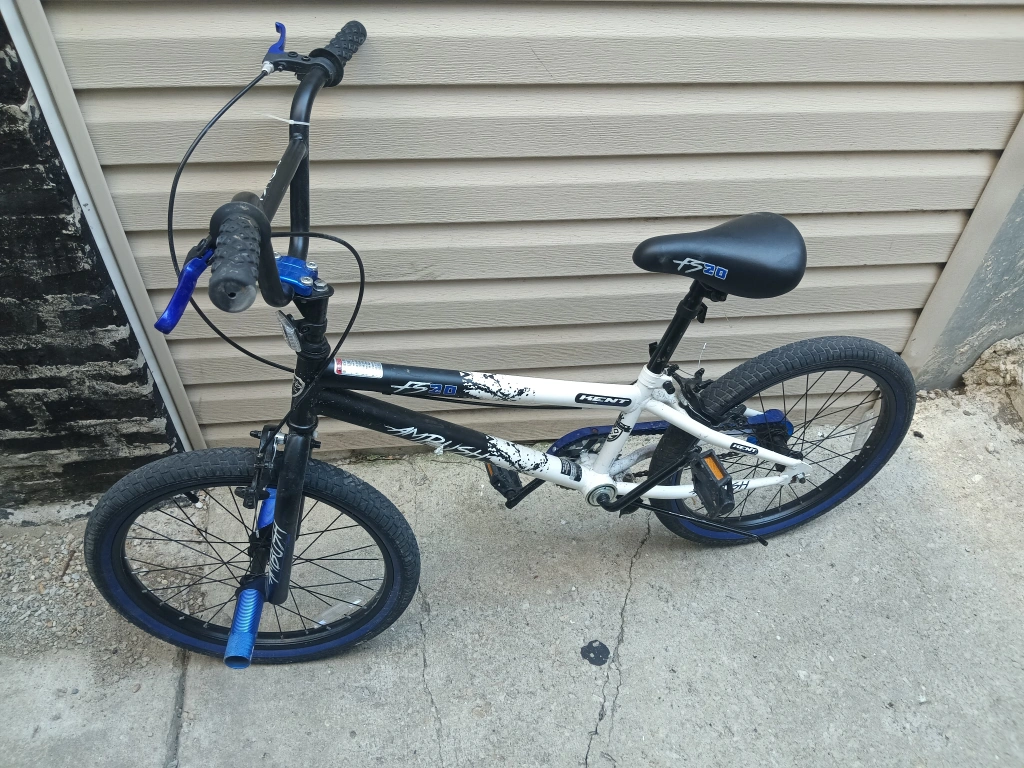 Selling a Kent Ambush F320 BMX bike. It's in good condition and ready for a new rider! The bike features a black and white frame with blue accents on the tires and handlebars.