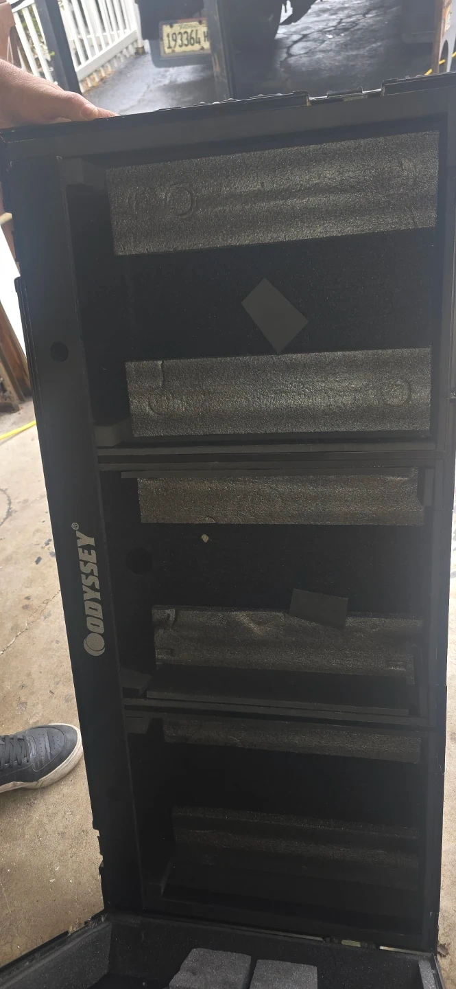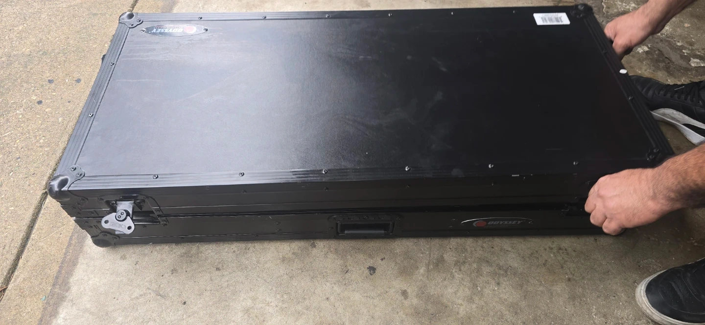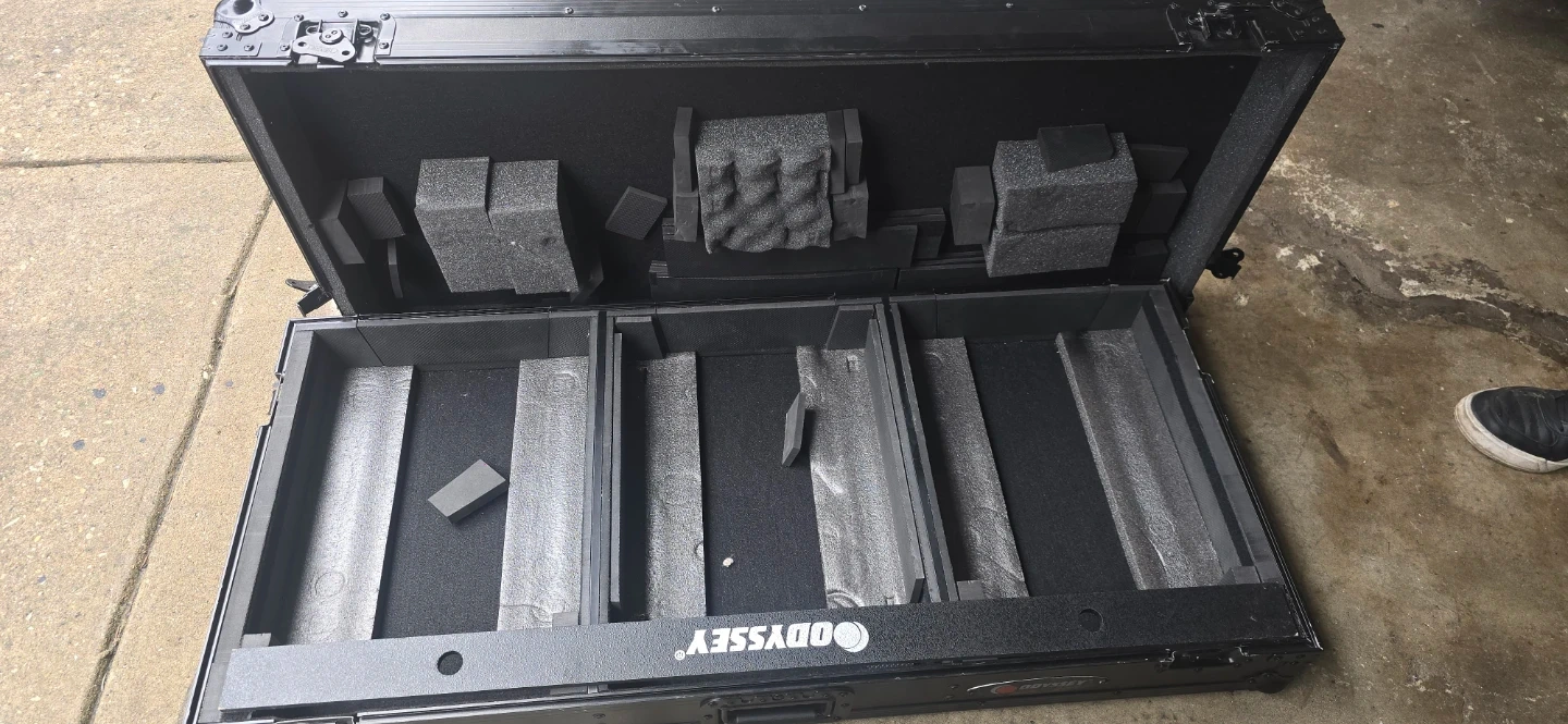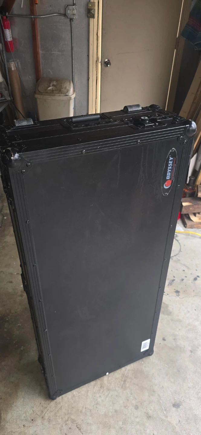 Odyssey protective case fordj equipment. Black exterior with reinforced corners and latches. Interior features foam padding and dividers for secure transport. It's a durable flight case for gear.