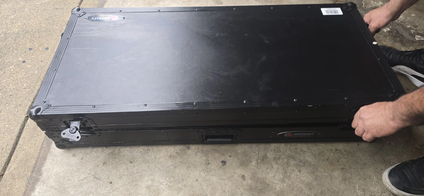 Odyssey protective case fordj equipment. Black exterior with reinforced corners and latches. Interior features foam padding and dividers for secure transport. It's a durable flight case for gear.