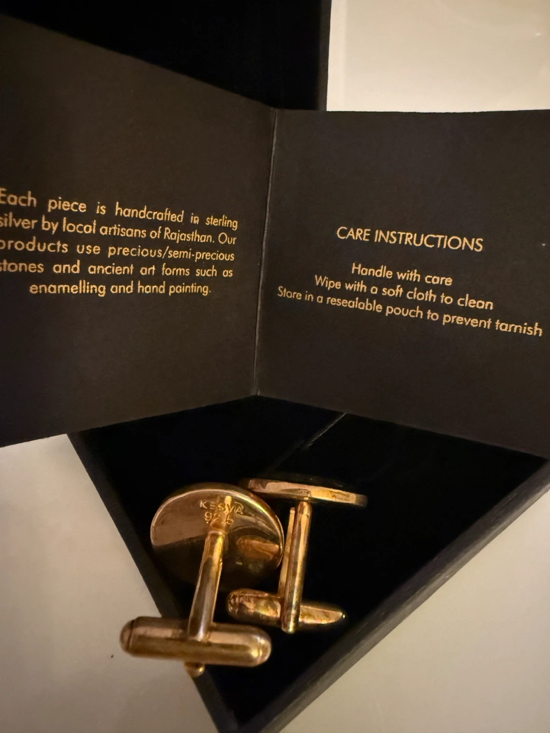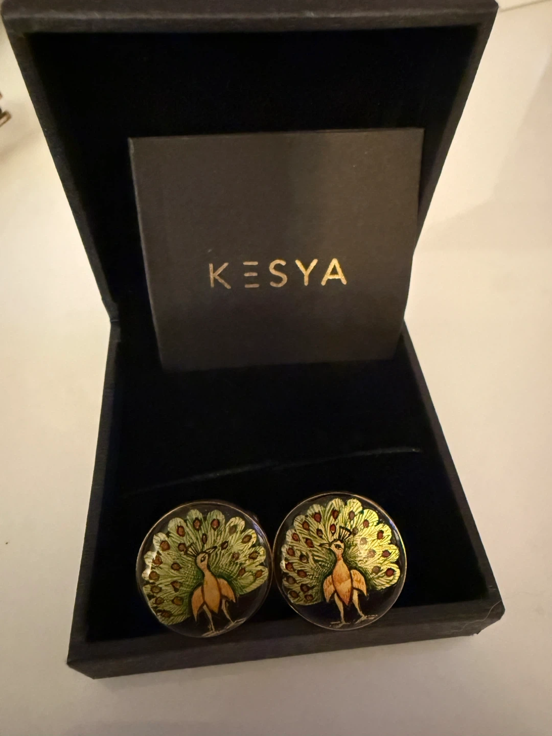 345Here are some beautiful cufflinks by Kesya! They feature a unique peacock design. They come in their original box and include care instructions. Each piece is handcrafted in sterling silver by local artisans of Rajasthan. Our products use precious/semi-precious stones and ancient art forms such as enamelling and hand painting