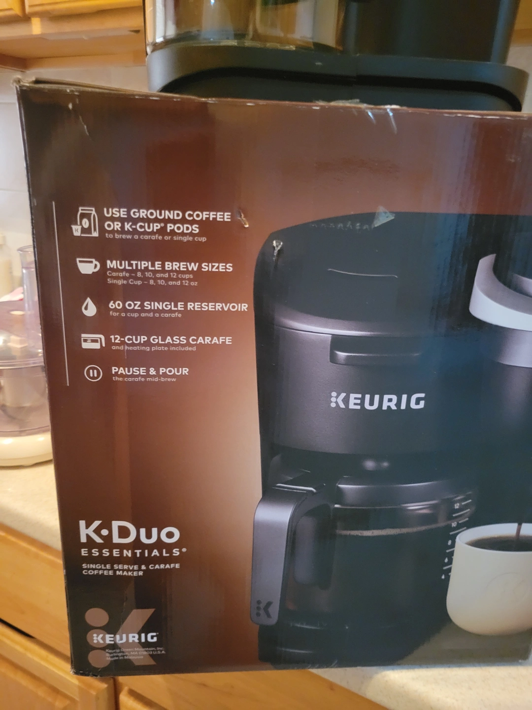 New Keurig K-Duo Essentials coffee maker. Brews K-cups or ground coffee. Makes single cups or a full carafe. 60 oz reservoir. 12-cup glass carafe included.