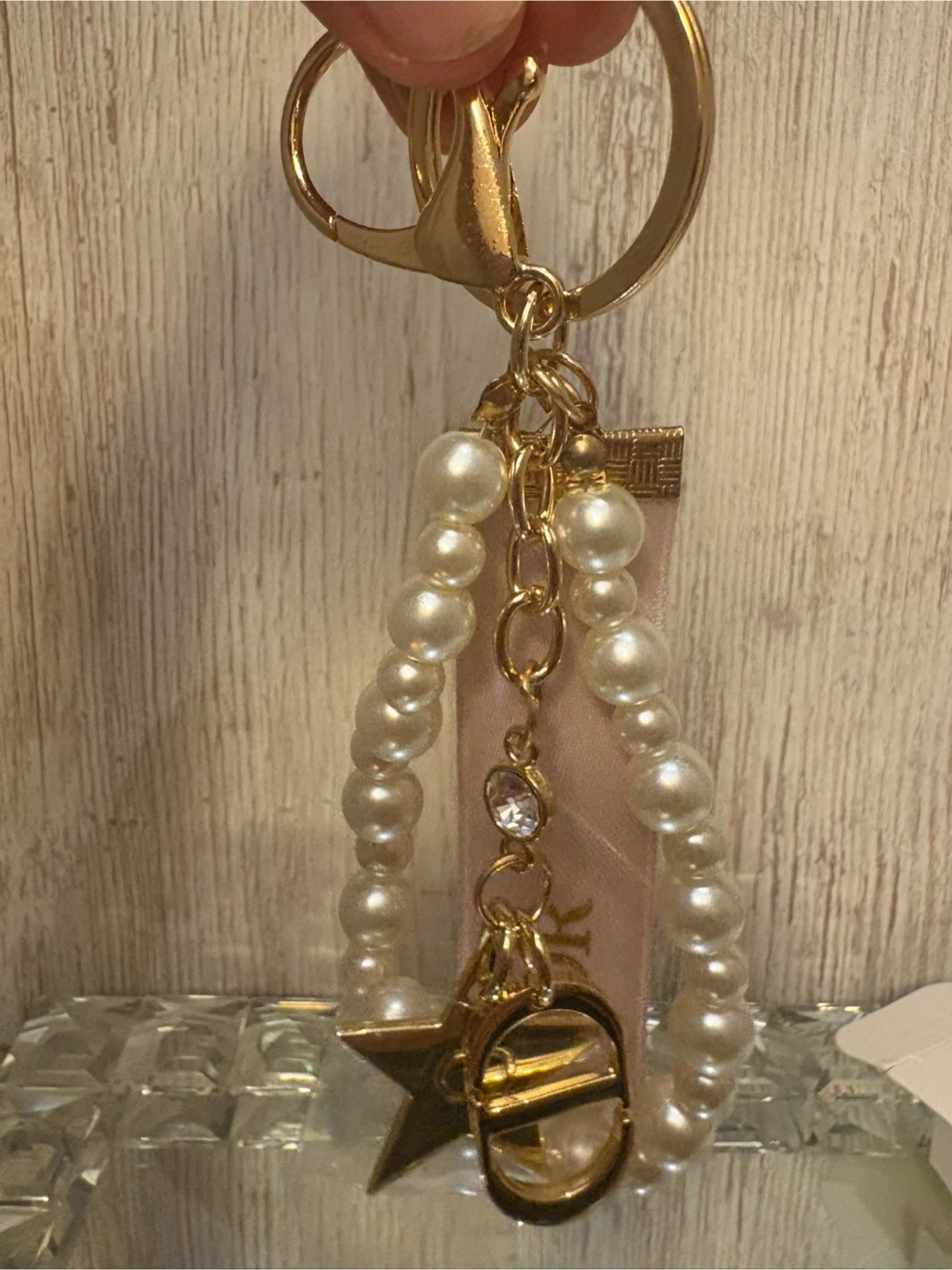 65Selling a Dior key chain new ! It features a strand of pearls, a gold-tone star and CD charms, and a pale pink ribbon with the Dior logo. It also comes with its original box