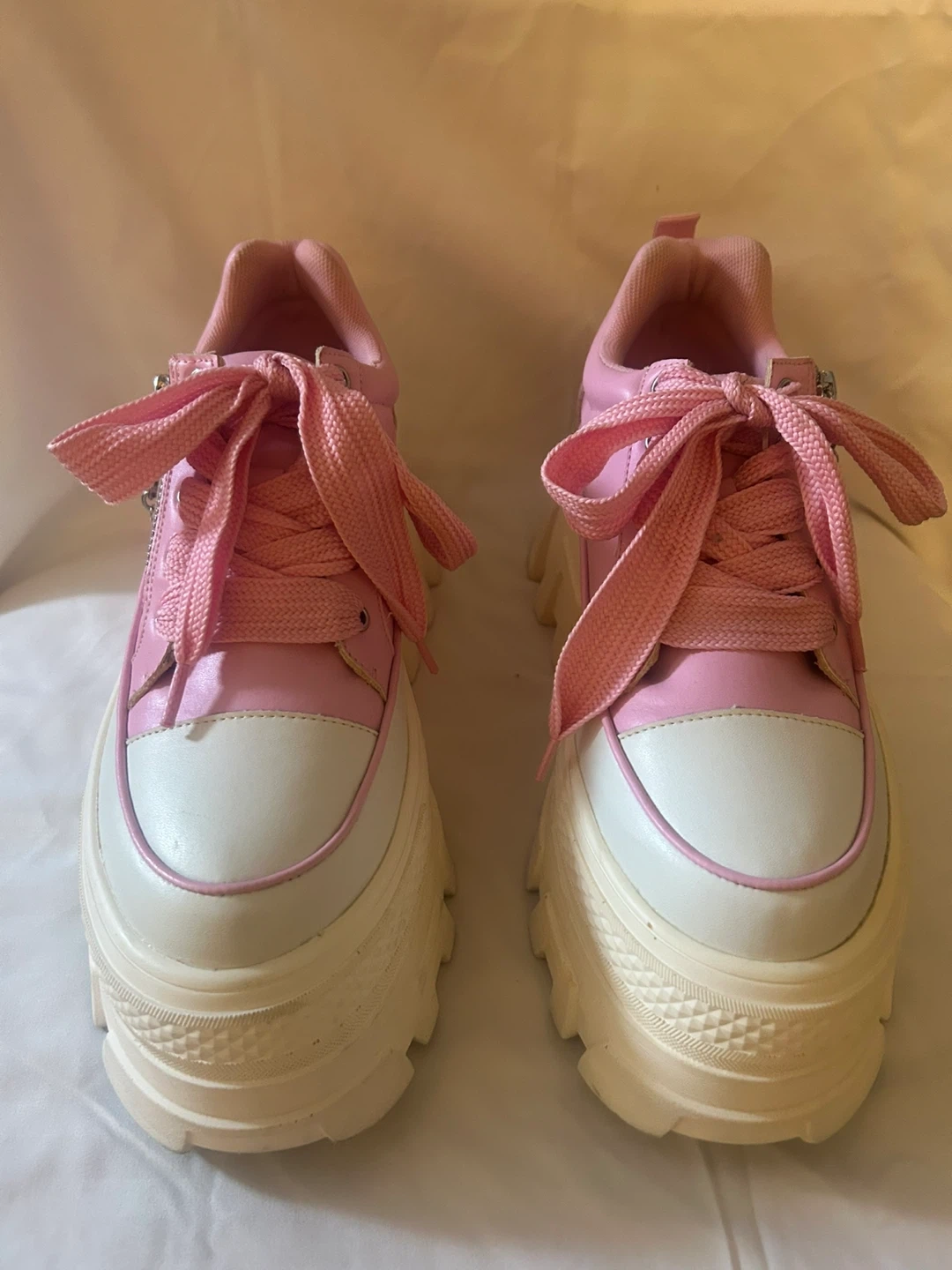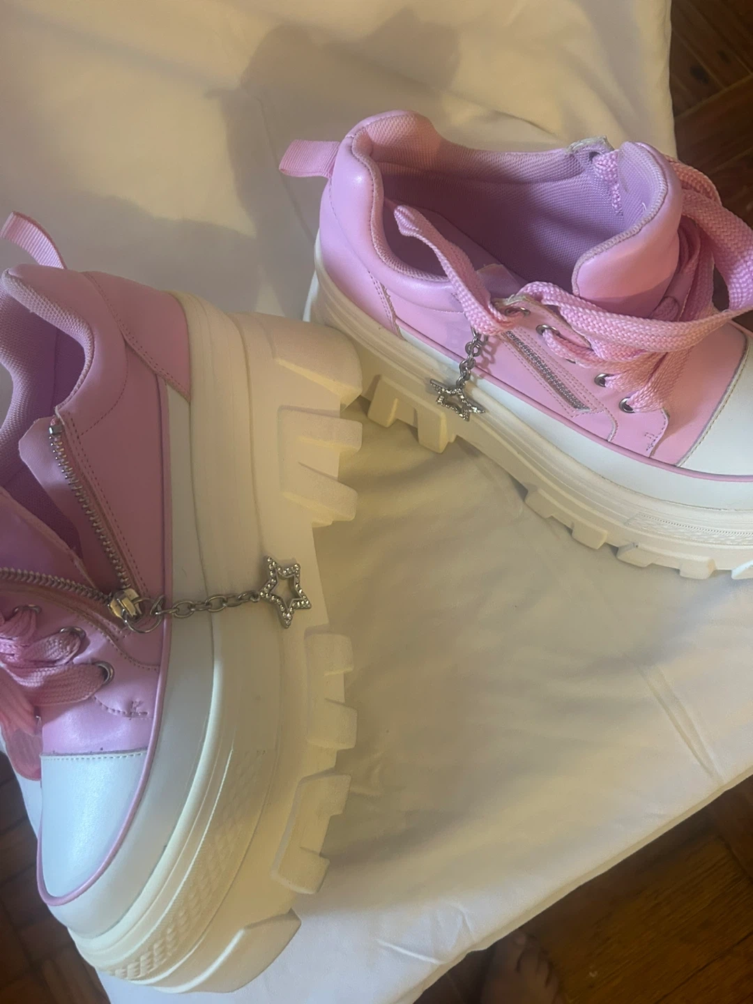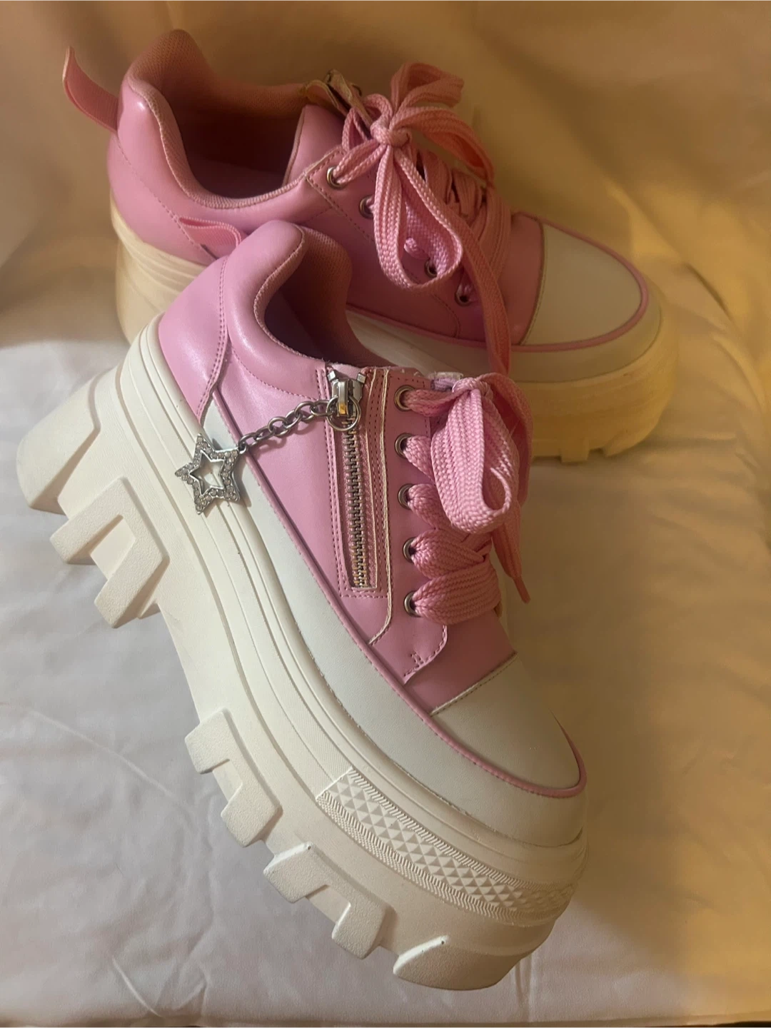 Chunky platform sneakers in a cute pink and white colorway. They feature lace-up fronts and side zippers for easy wear. A star charm is attached to the laces for extra flair! Perfect for adding some Y2K vibes to your outfit.