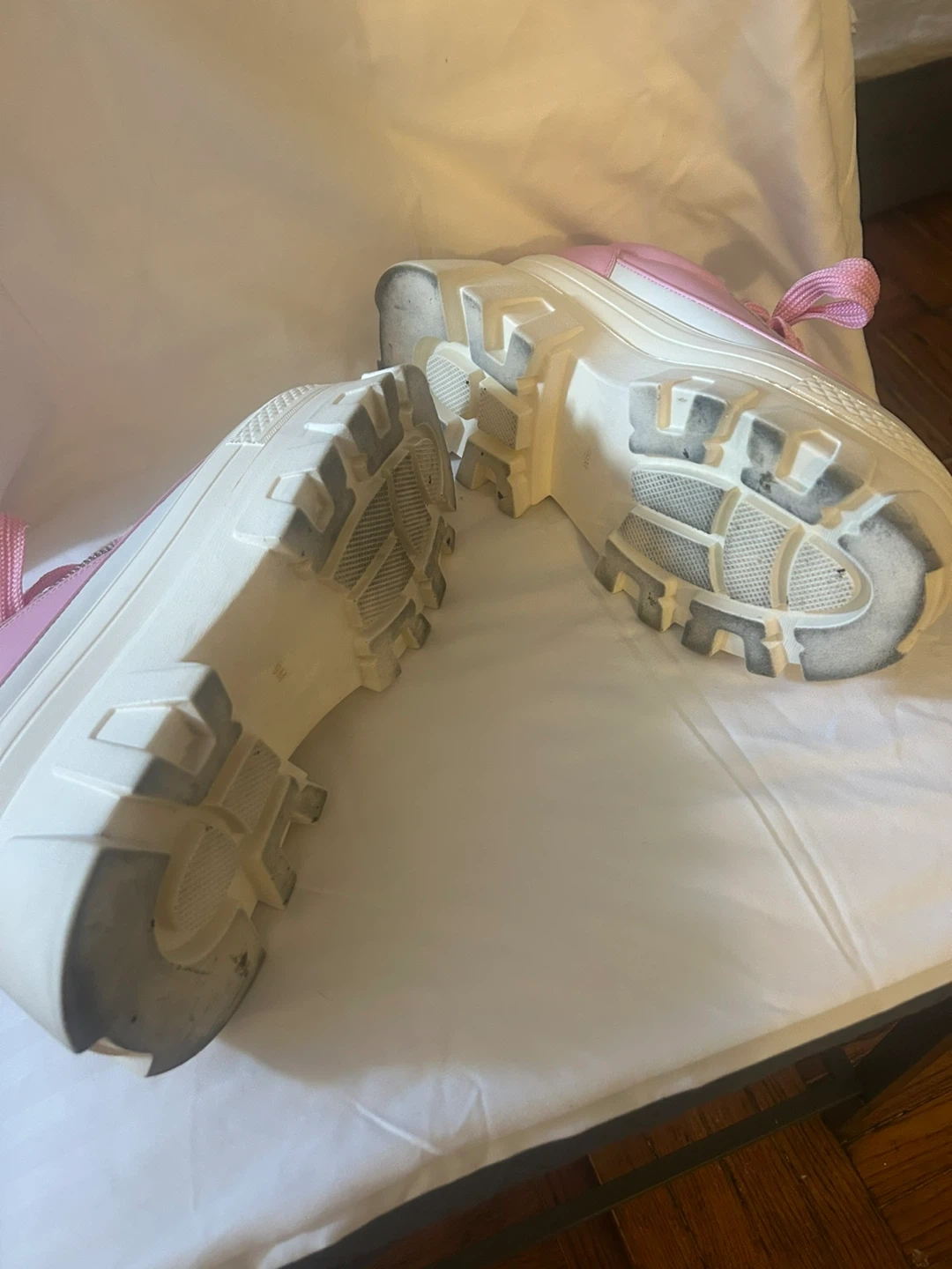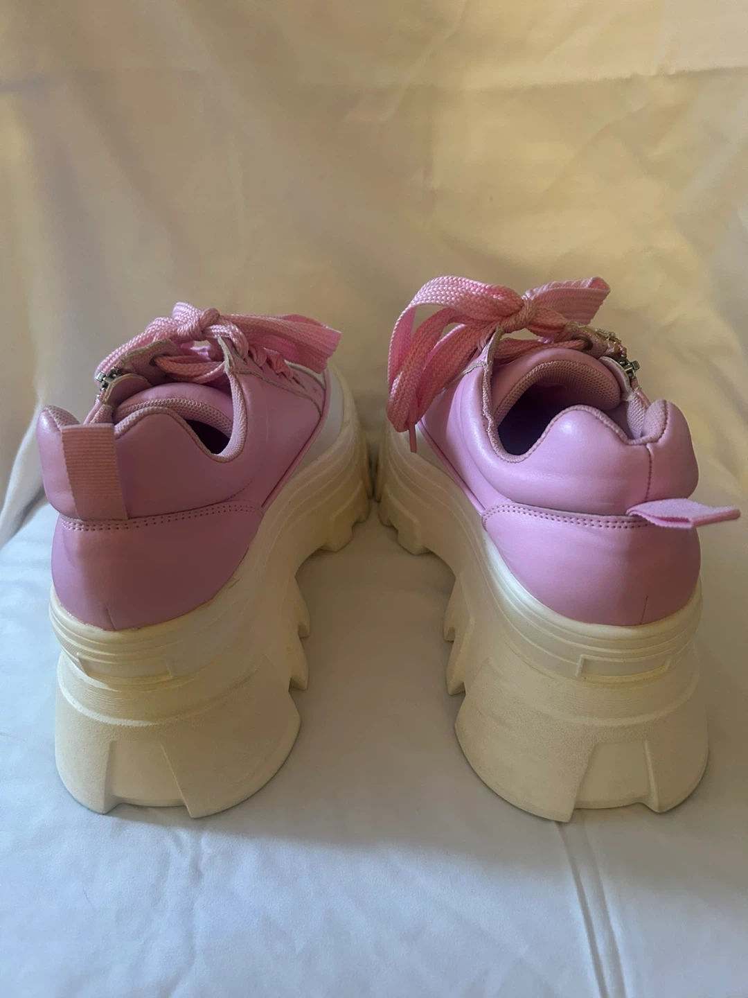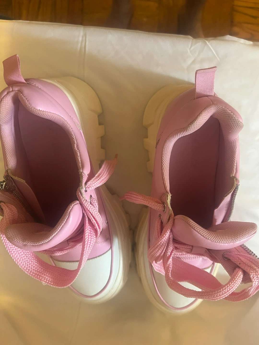 Chunky platform sneakers in a cute pink and white colorway. They feature lace-up fronts and side zippers for easy wear. A star charm is attached to the laces for extra flair! Perfect for adding some Y2K vibes to your outfit.