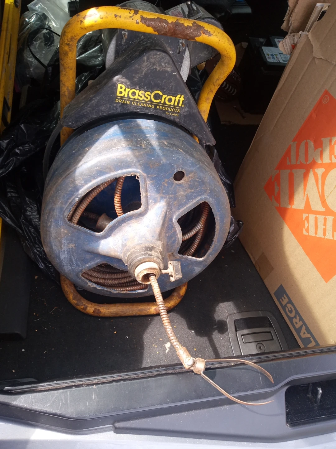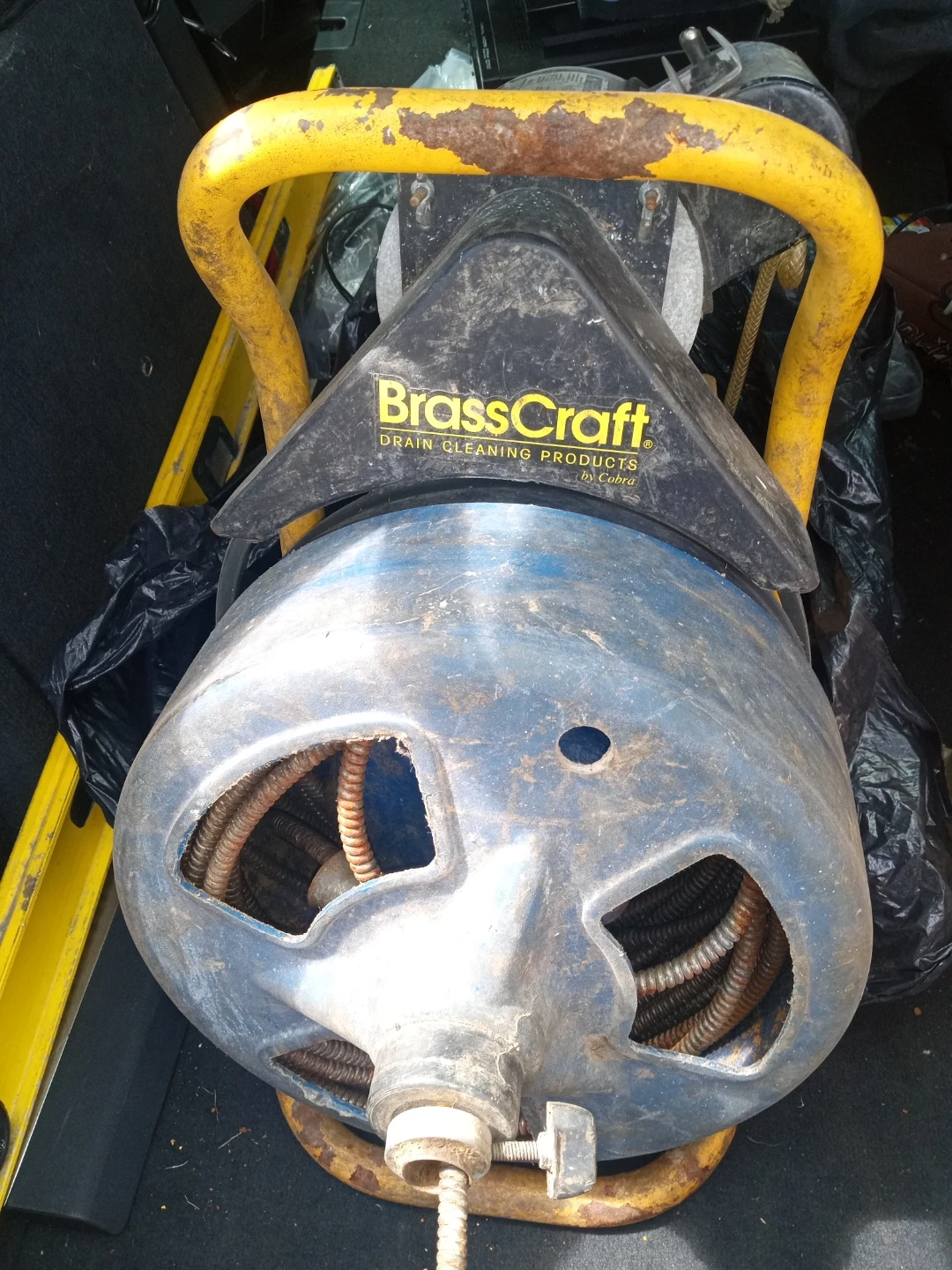 This is a BrassCraft BC400 Series drain cleaning machine. It's designed for clearing clogged pipes. Comes with the drain cleaning cable.