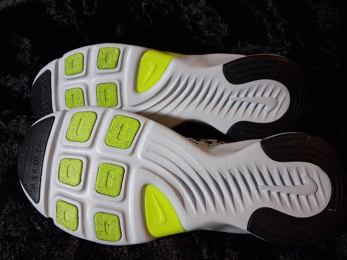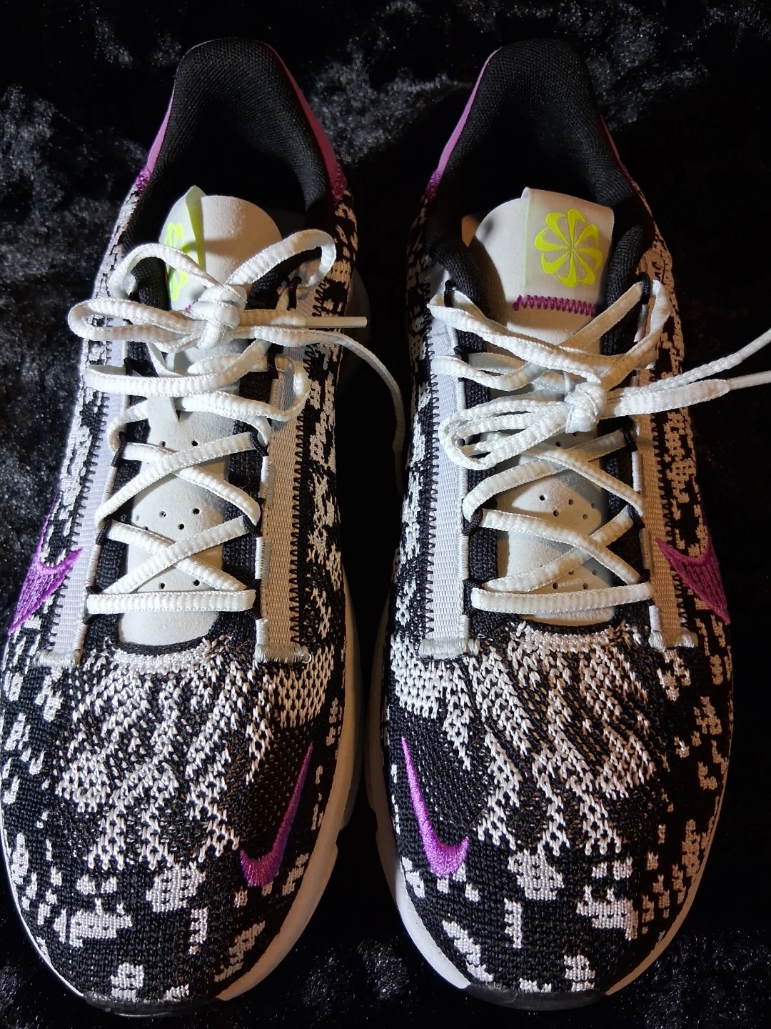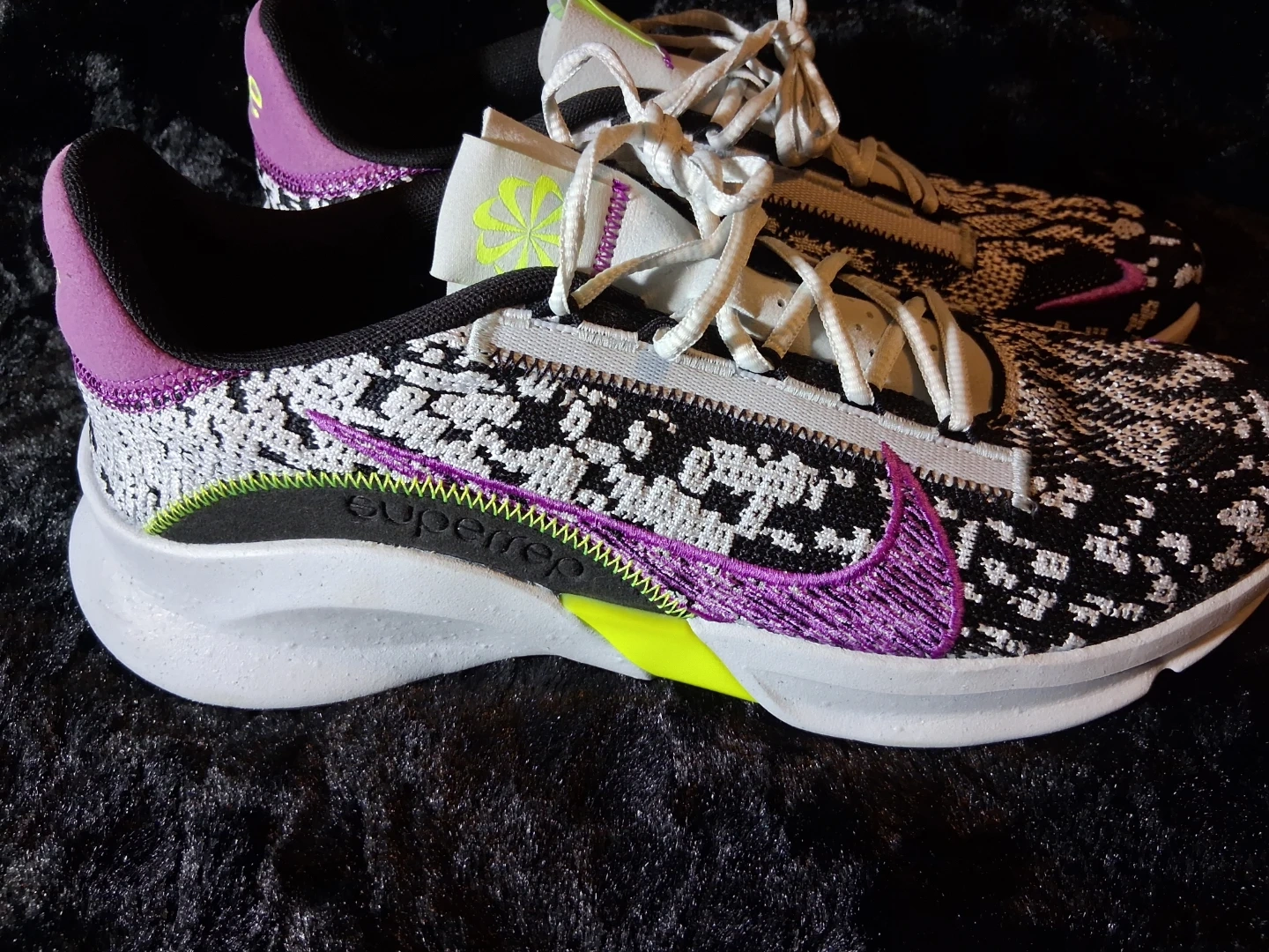Nike SuperRep Go 2 women's training shoes in a black, white, purple, and neon yellow. Lace-up closure with a comfortable fit. Size 9.