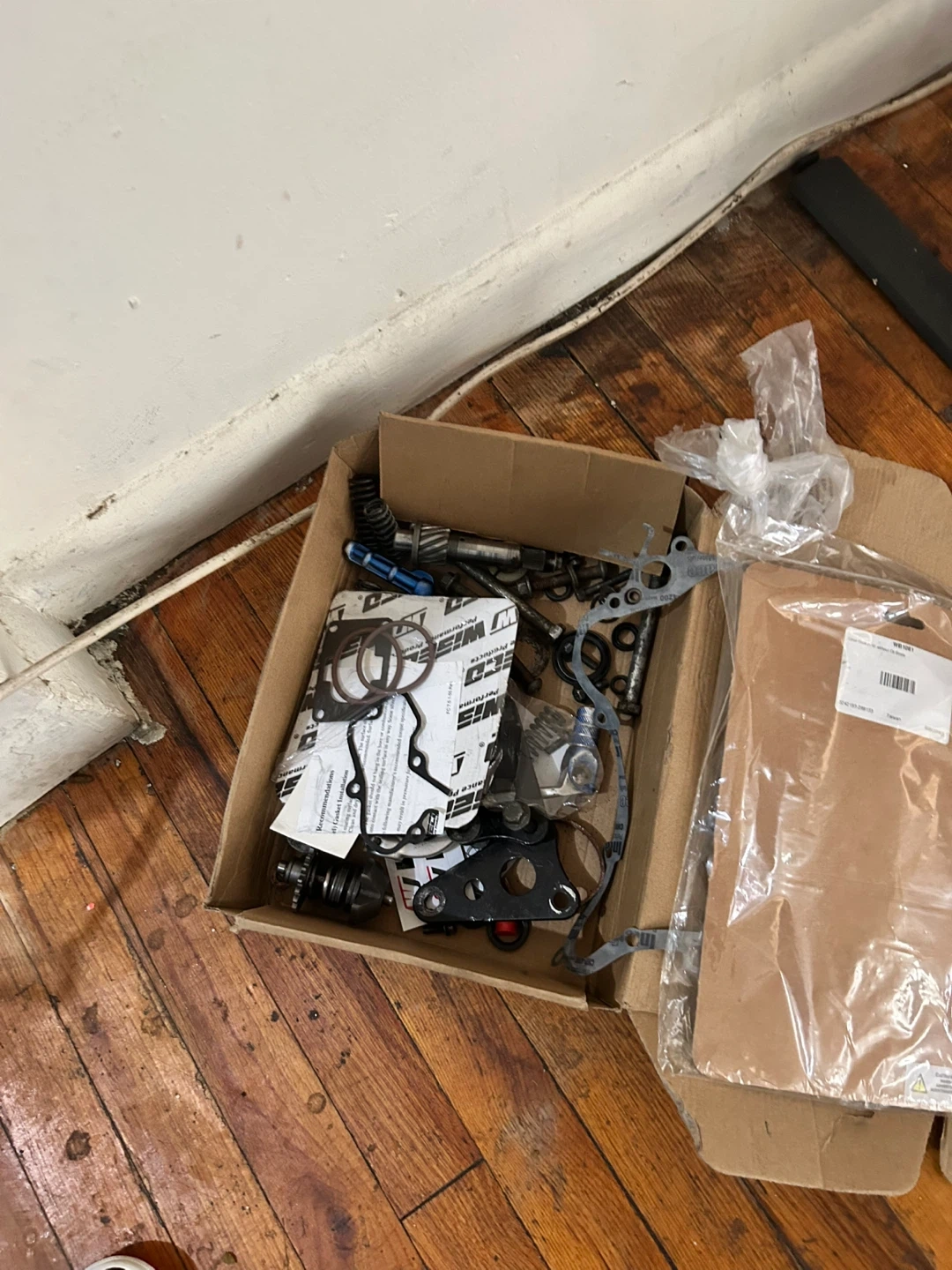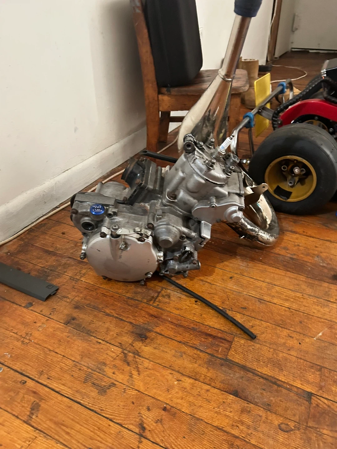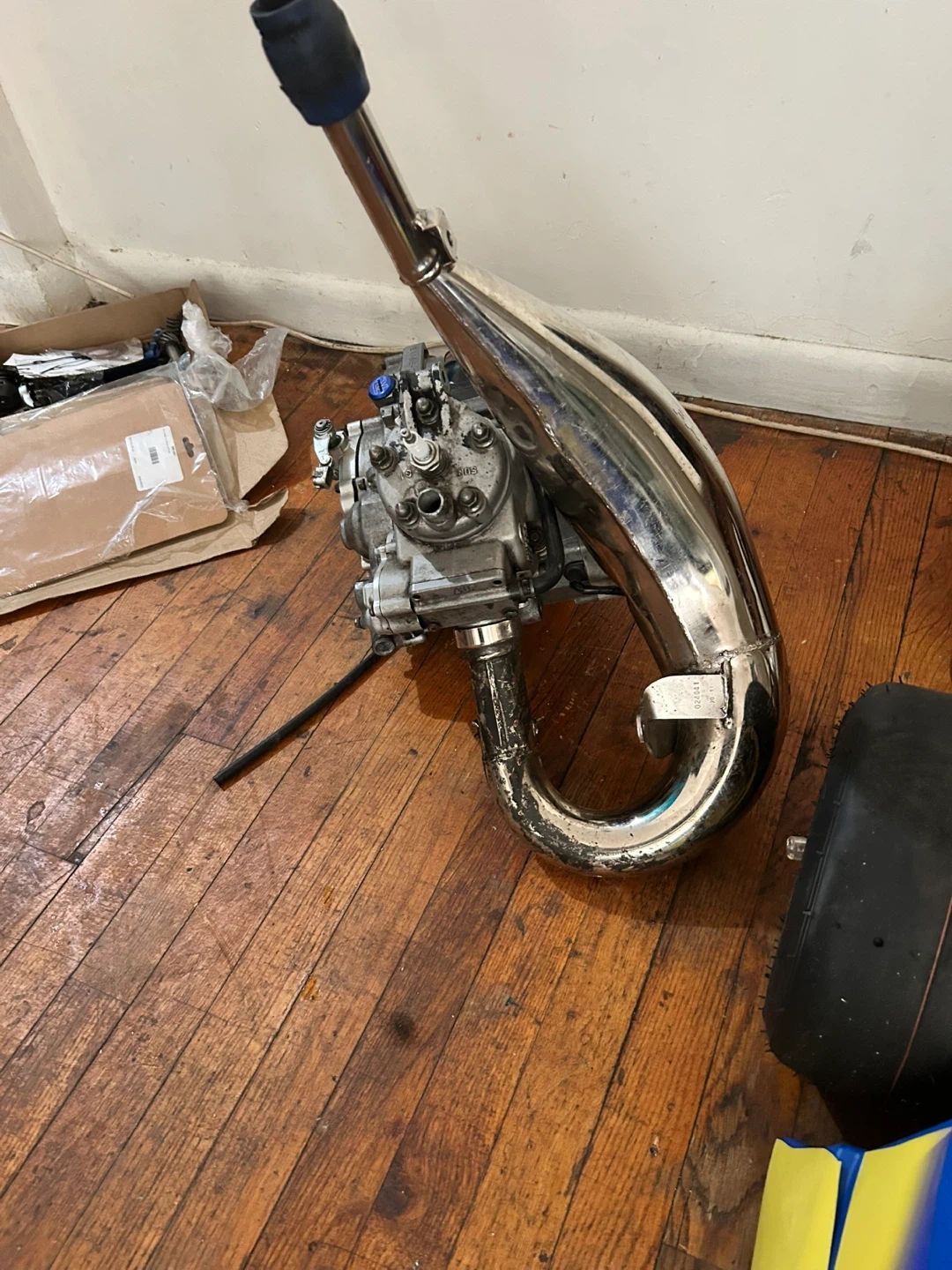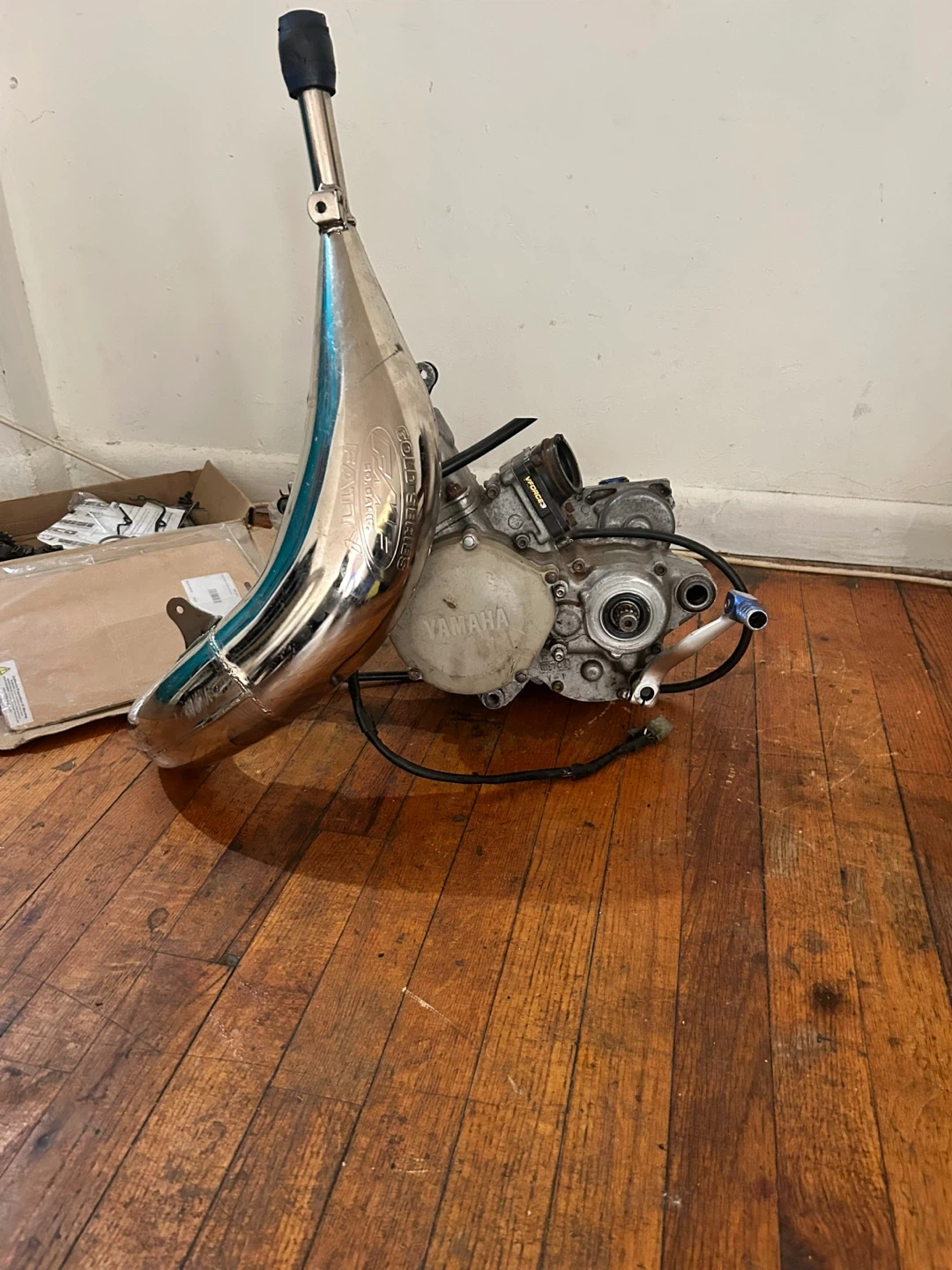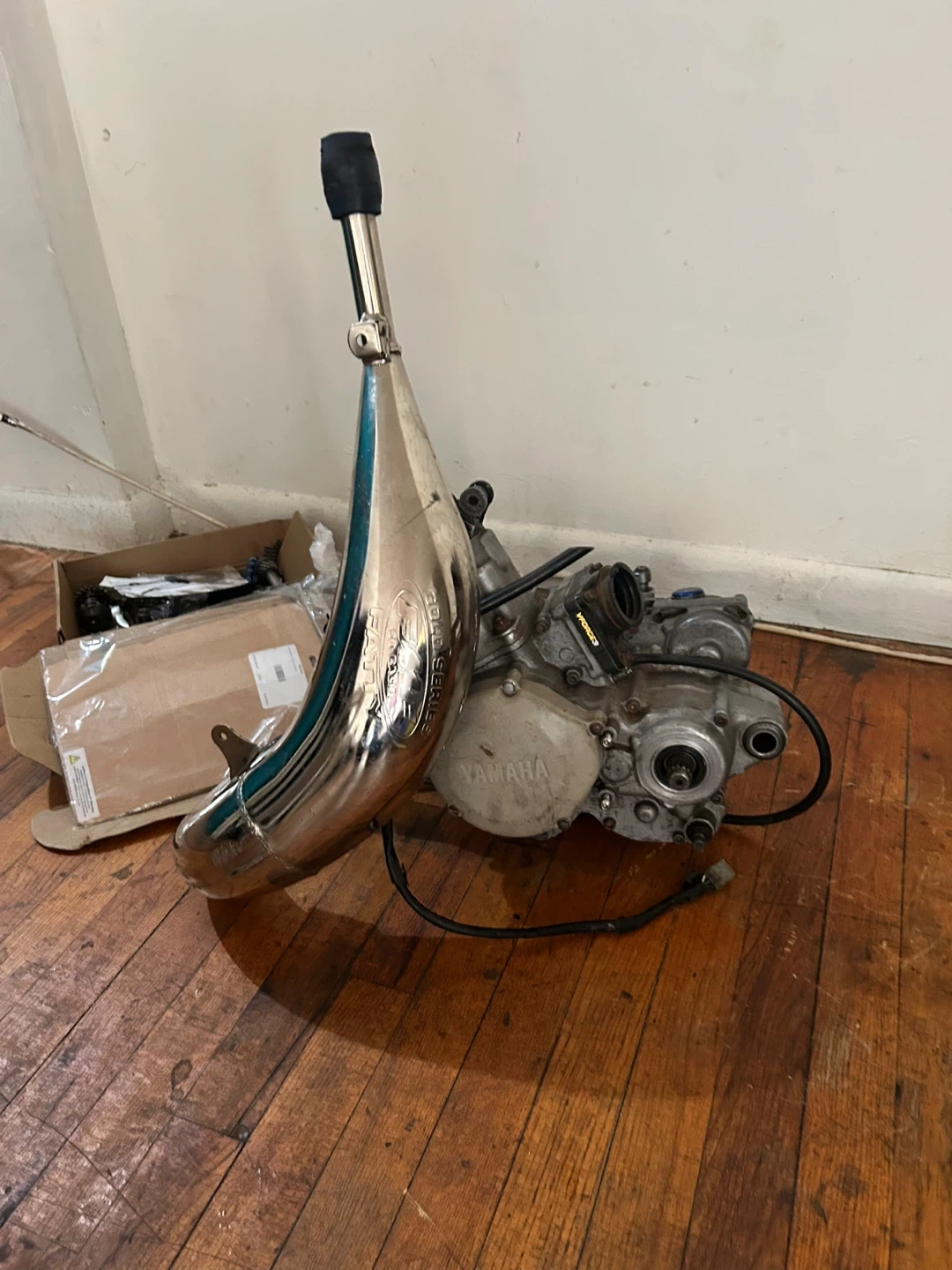 Yamaha two-stroke engine assembly. Includes chrome exhaust pipe and a box of assorted gaskets. Engine appears to be from a dirt bike or similar recreational vehicle.