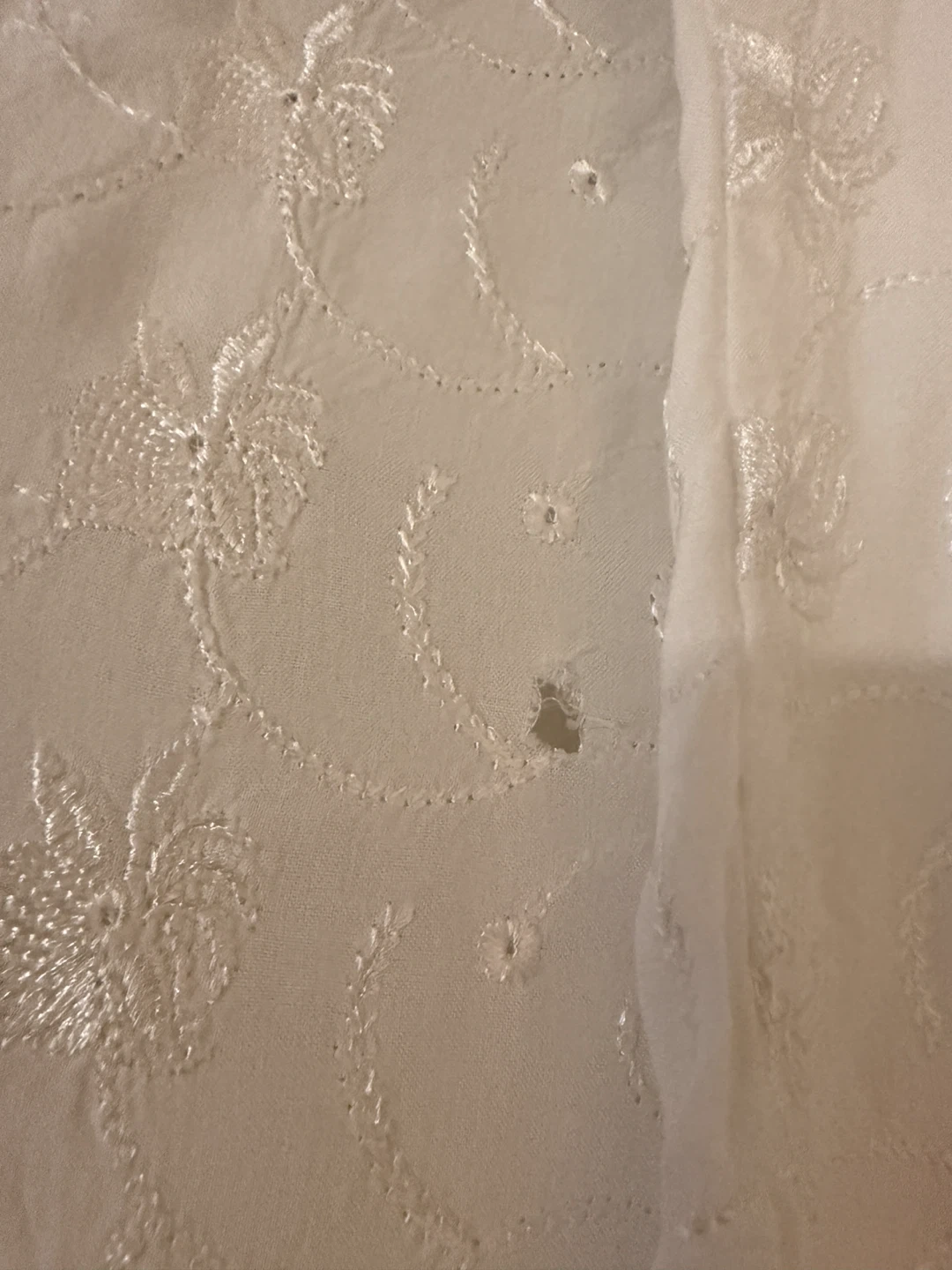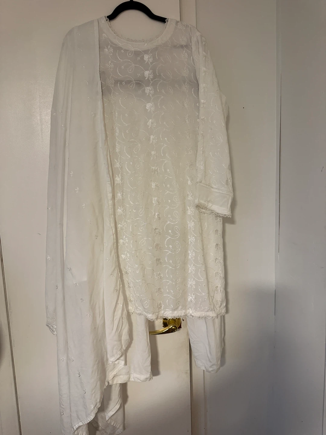 Selling a beautiful white salwar kameez with delicate embroidery. It's in good condition, perfect for a special occasion or everyday wear. There is a small hole in the fabric.
