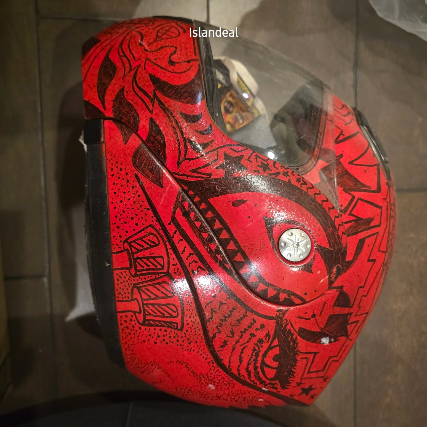 Red Motorcycle Helmet with Black Tribal Design