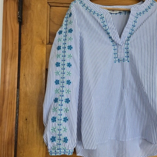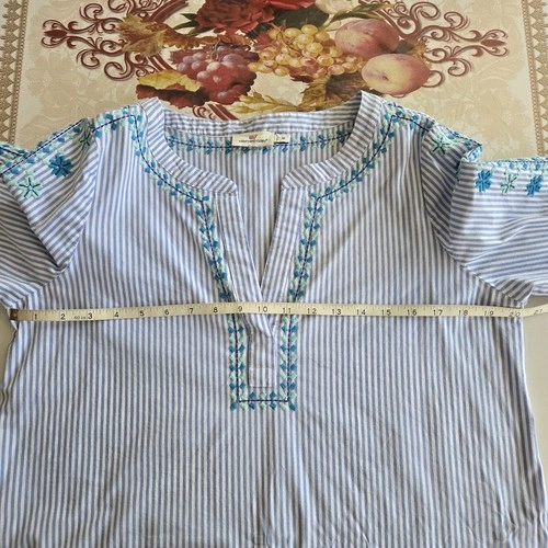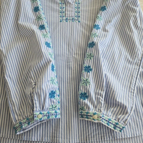 Classic Blue & White stripe V-Neck with beautiful embroidery down front & sleeves.