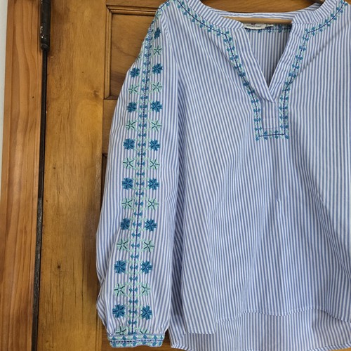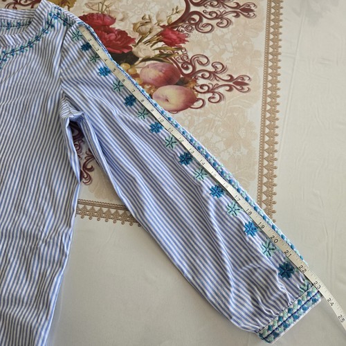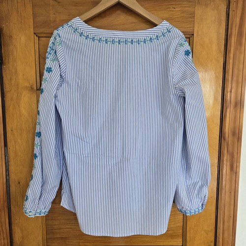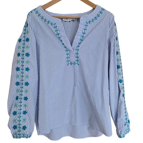 Classic Blue & White stripe V-Neck with beautiful embroidery down front & sleeves.