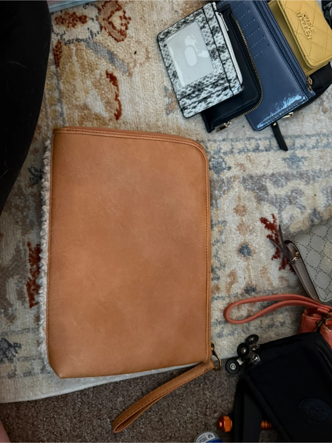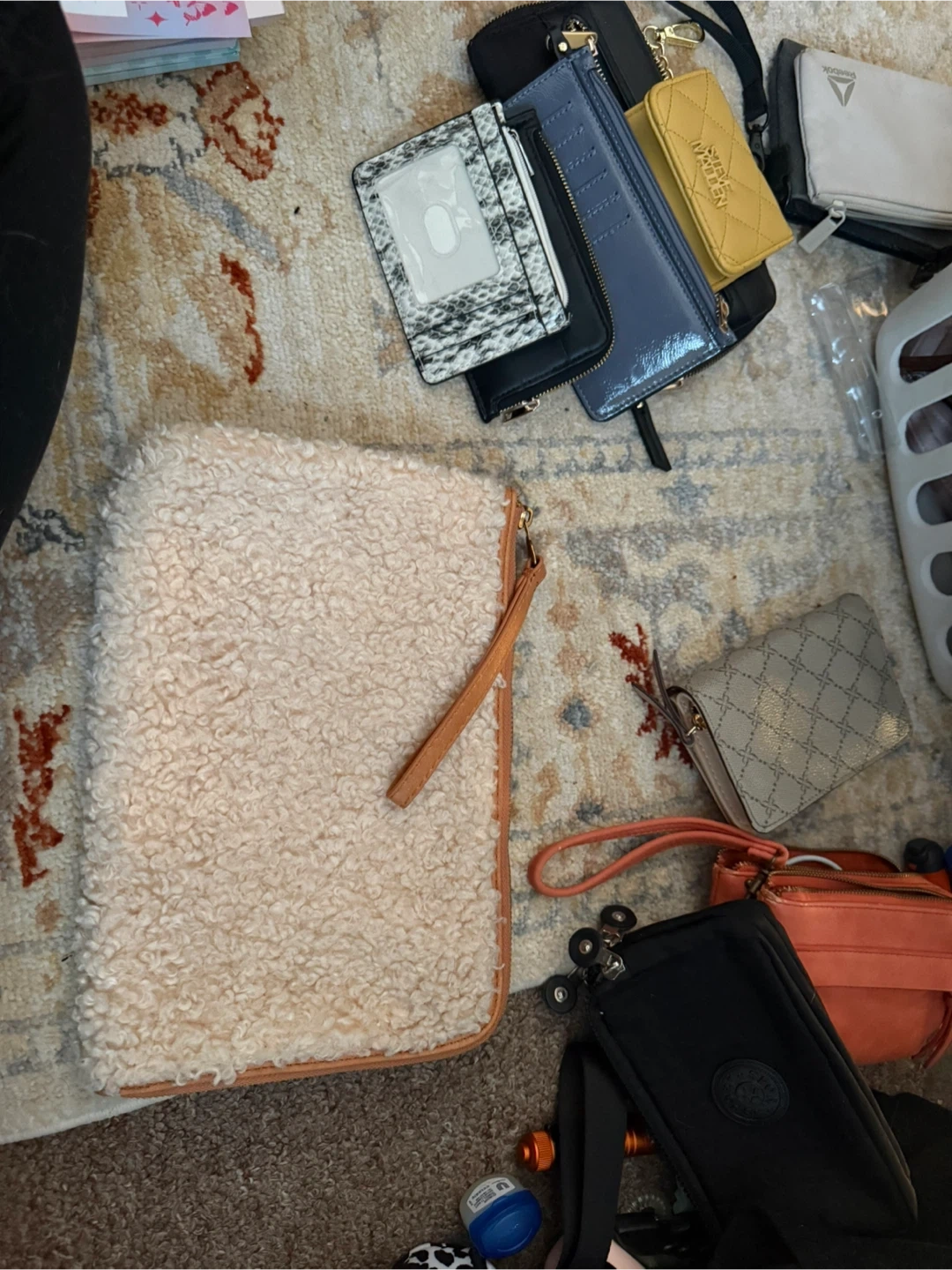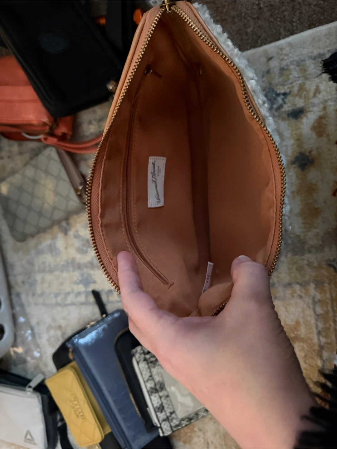 This Universal Thread clutch features a fuzzy exterior with a faux leather trim and wrist strap. It has a zippered closure and an interior zip pocket. It's perfect for everyday use!