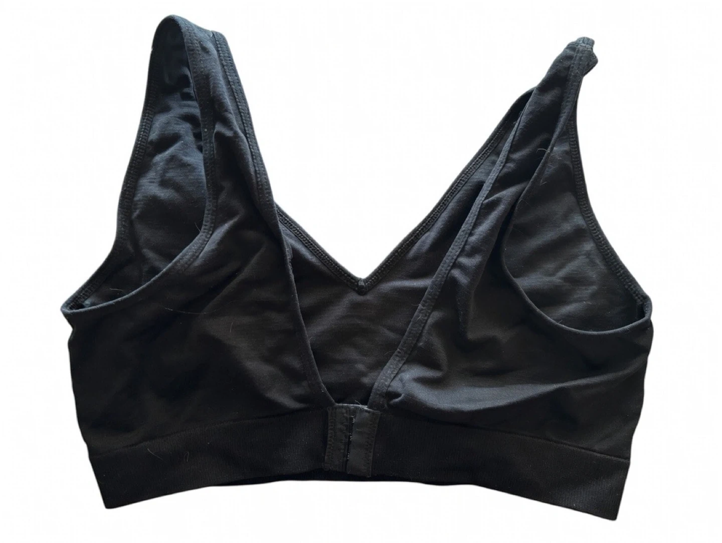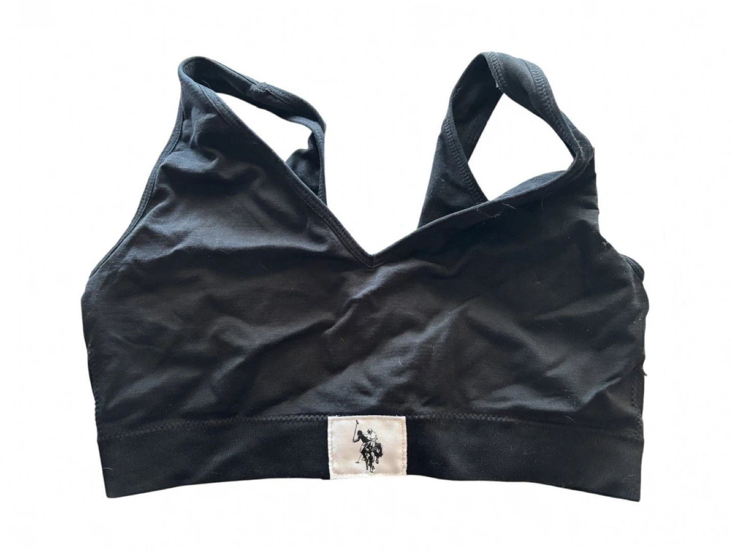 U.S. Polo Assn. black sports bra. Pullover style with a V-neck and racerback. 95% cotton, 5% spandex blend. Machine washable.