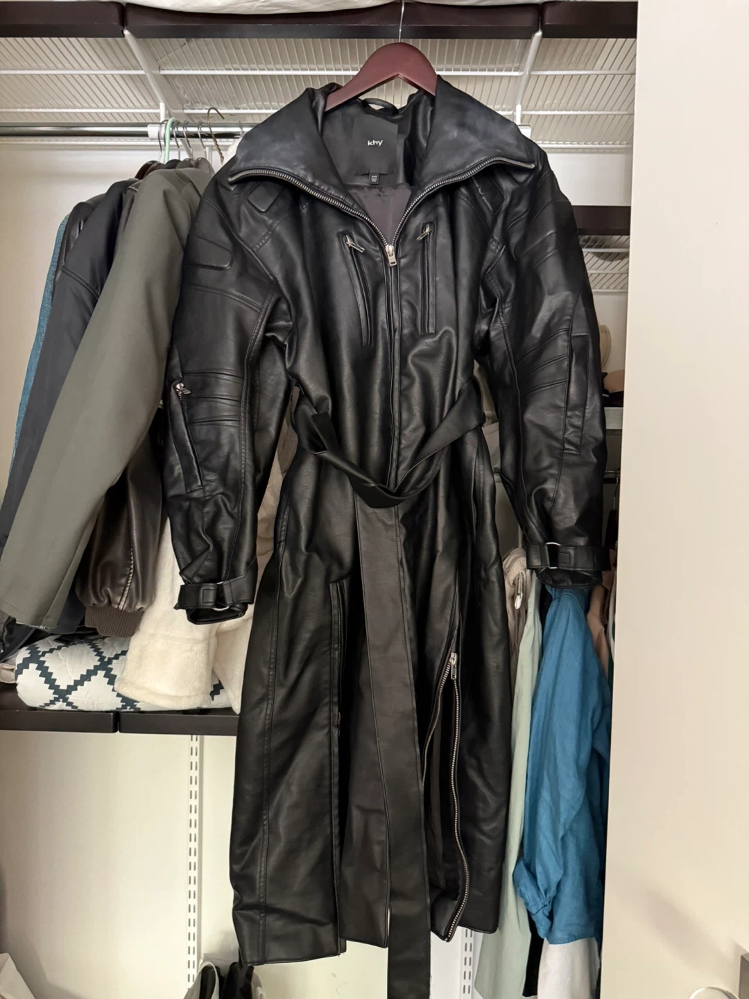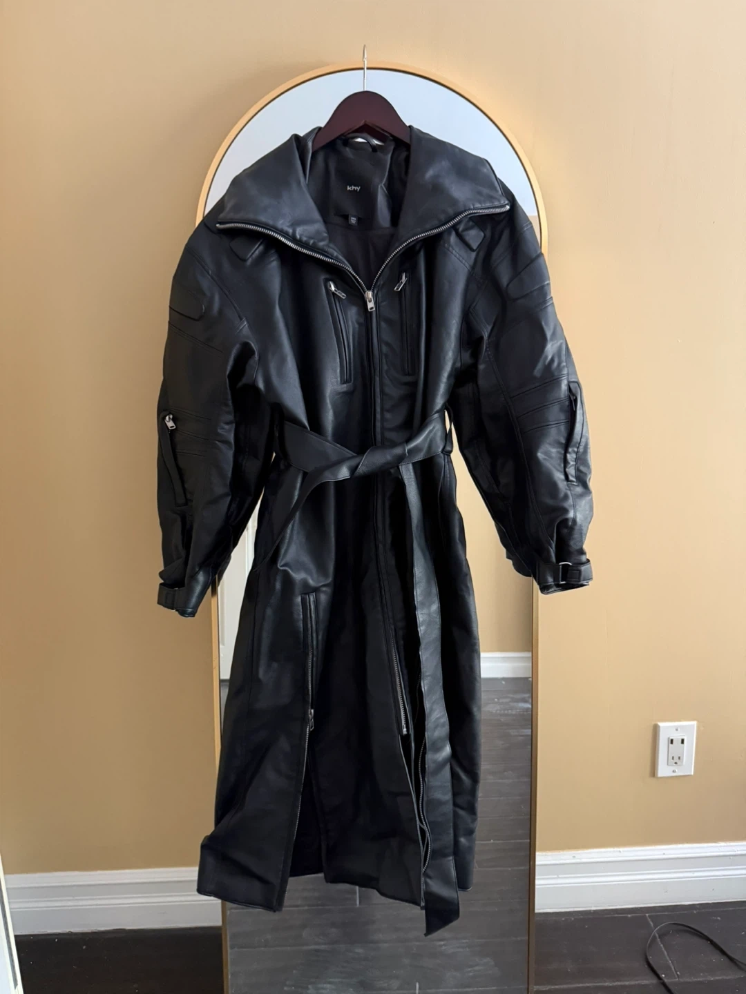 Selling a stylish black leather trench coat from khy! It features a unique design with multiple zippers and a waist belt. Perfect for adding an edgy touch to your wardrobe.