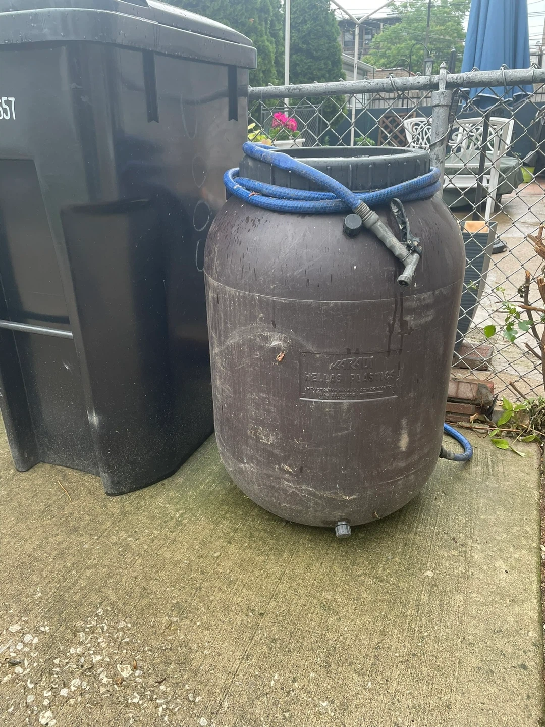 This is a large, dark brown plastic water barrel. It comes with a blue garden hose and a spray nozzle attached. Includes a spigot at the bottom for easy drainage. Perfect for collecting rainwater or storing water.