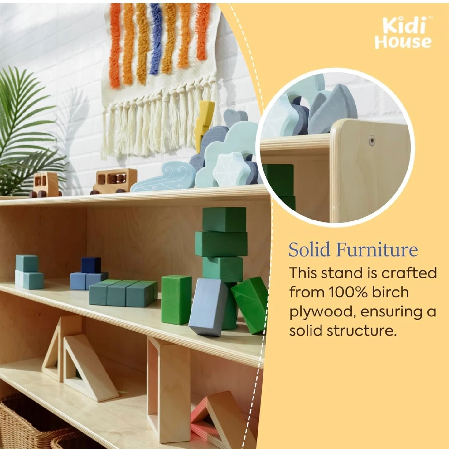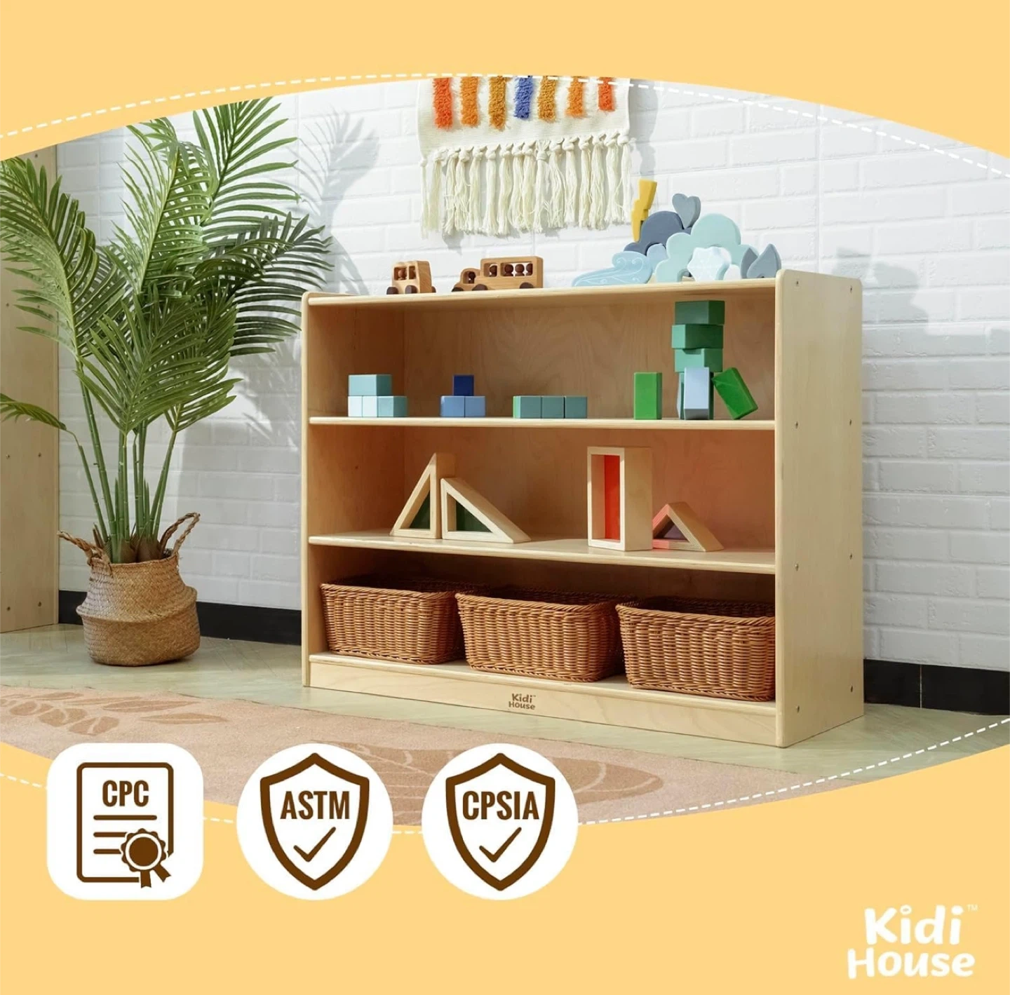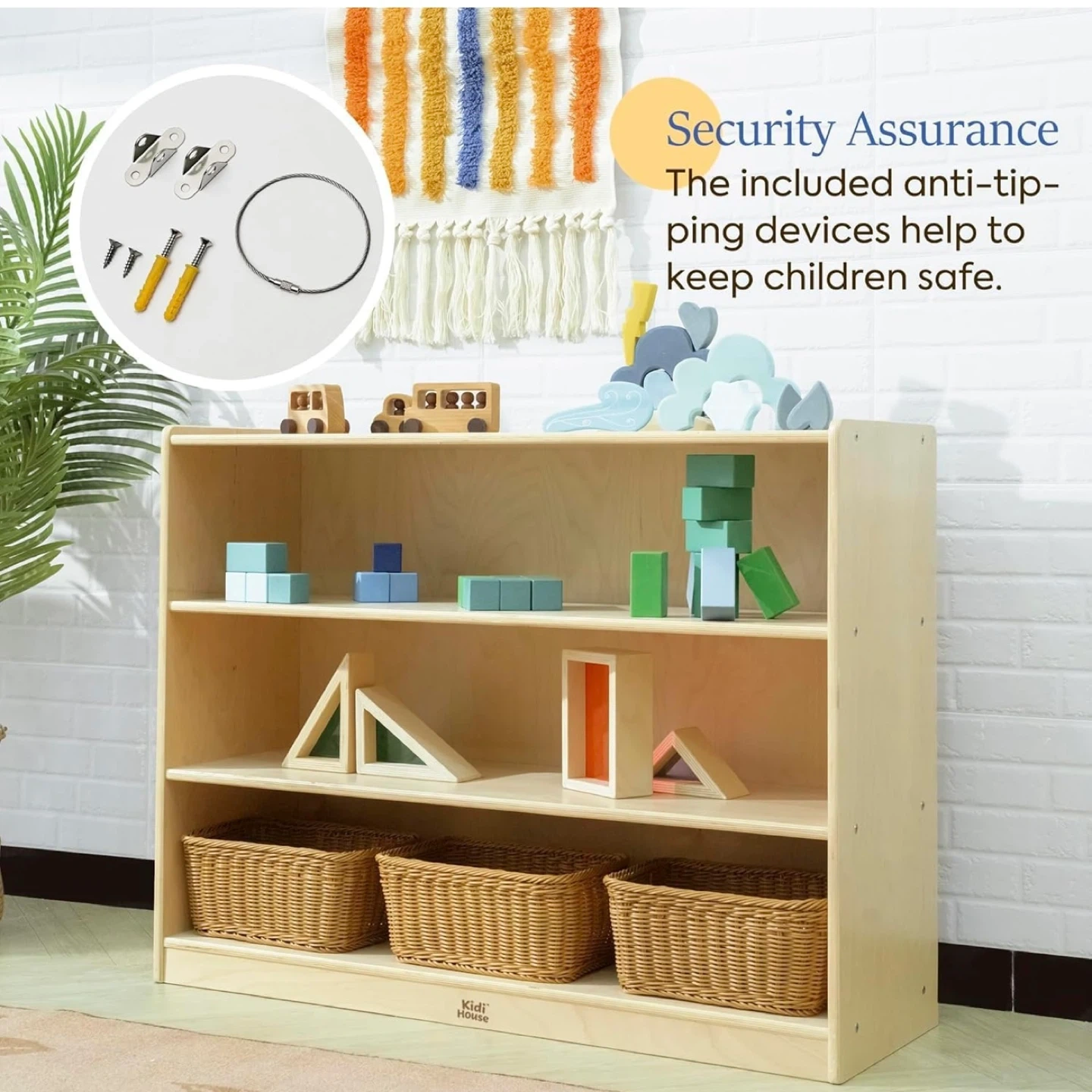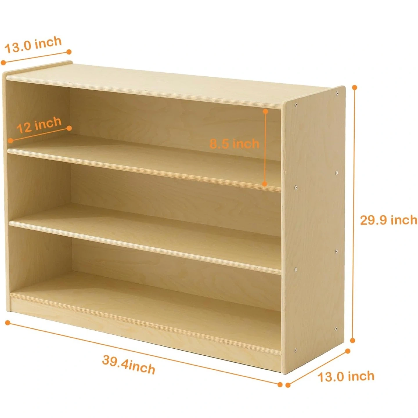 This Kidi House 3-tier bookshelf is perfect for organizing your little one's books and toys! It's made from 100% birch plywood, ensuring a solid and durable structure. The included anti-tipping devices help keep children safe. Still in box. Purchased for a nursery but ended up going with a different color bookshelf. Dimensions: - Height: 29.9 inches - Width: 39.4 inches - Depth: 13 inches - Shelf Height: 12 inches - Shelf Depth: 8.5 inches
