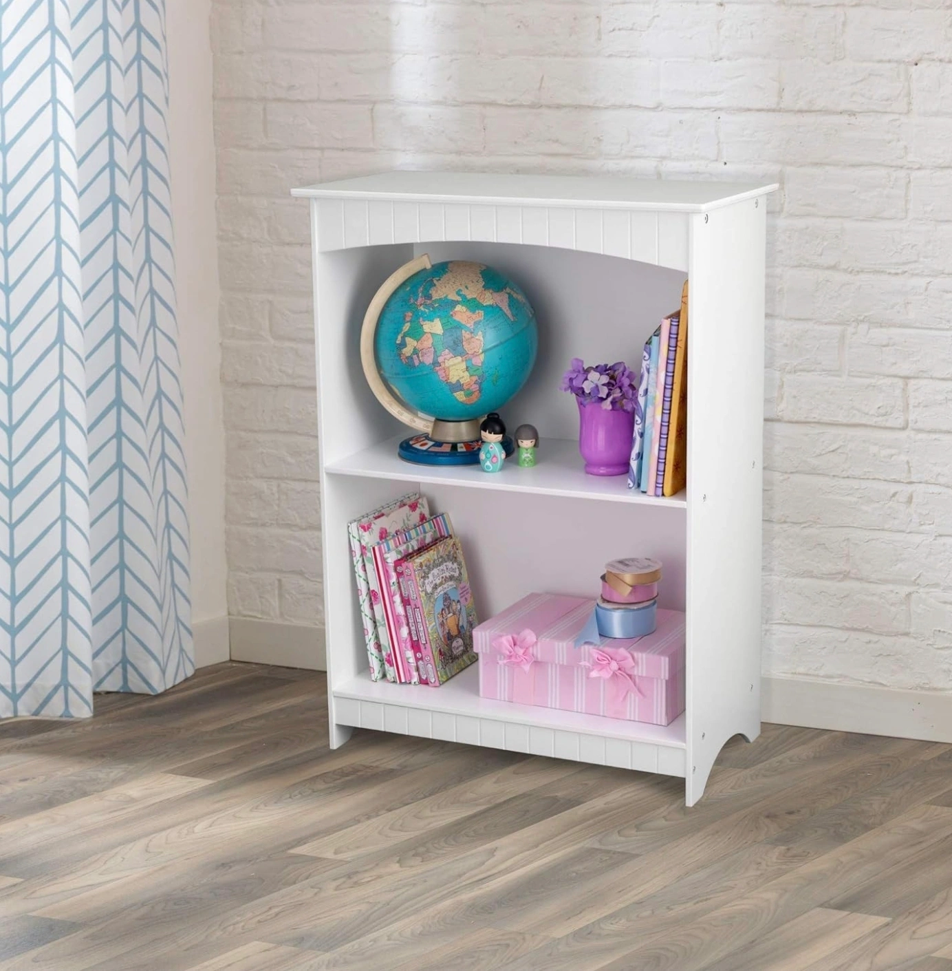 KidKraft Nantucket Children's Wooden 2-Shelf Bookcase with Wainscoting Detail - White, Gift for Ages 3+ White Nantucket Bookcase New in the box Two deep shelves perfect for storing books, toys, picture frames and more Wainscoting detail Made of wood for durability Assembly required; includes detailed, step-by-step instructions