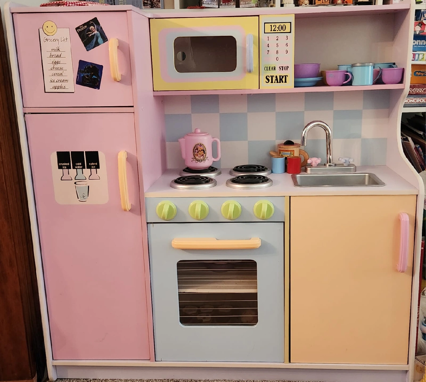 Selling a used kids play kitchen. It comes with additional accessories, including dishes, food, and cookware. Like wood pizza set, donut set, picnic bask,apron/mittens which itself costs hundreds. Is in good condition and ready for a new home