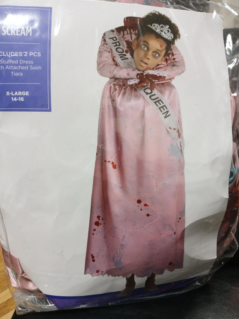 60Selling a variety of kids' costumes, including: - Harry Potter Gryffindor Robe (Child L/XL) - Scream Zombie Prom Queen (X-Large 14-16) - Includes stuffed dress with attached sash and tiara - Disney Descendants The Rise of Red (Child Large 12-14) - includes costume and wig - Punk Zombie (Large 12-14) - Includes jacket with attached tee and belt, leggings - Pink Tinsel Fringe Jacket (Adult Plus)