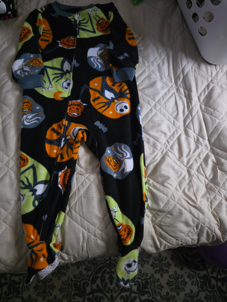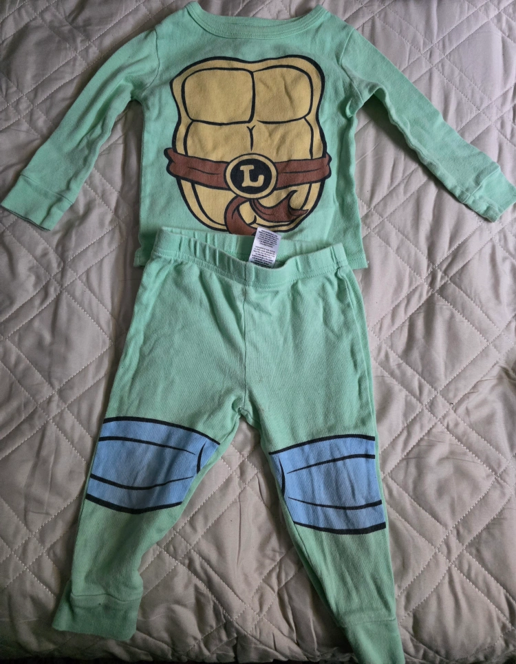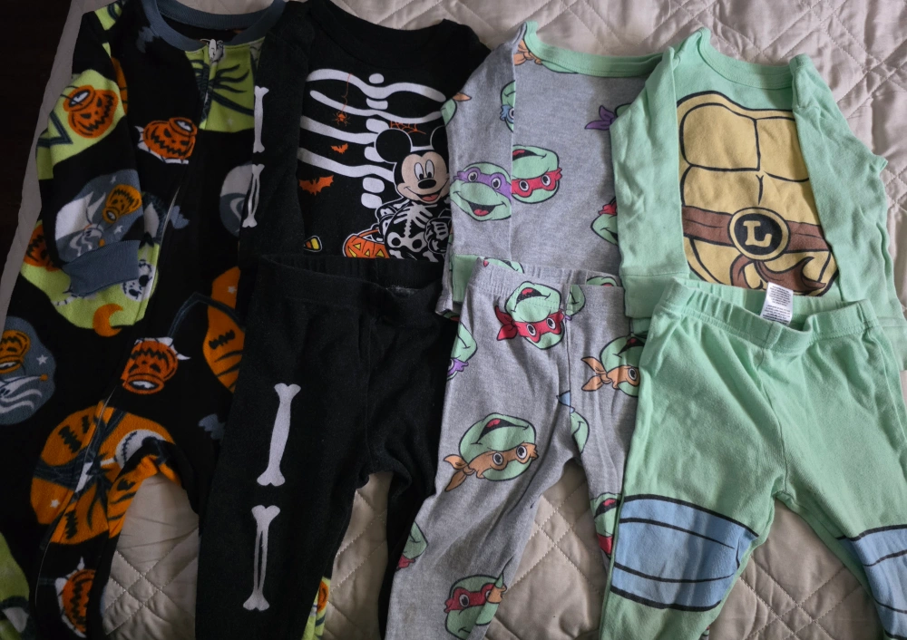 Selling a bundle of 2T kids' pajamas! There's a Halloween-themed footed pajama, a two-piece Mickey Mouse skeleton pajama set, and two sets of Ninja Turtle pajamas. Perfect for your little one!