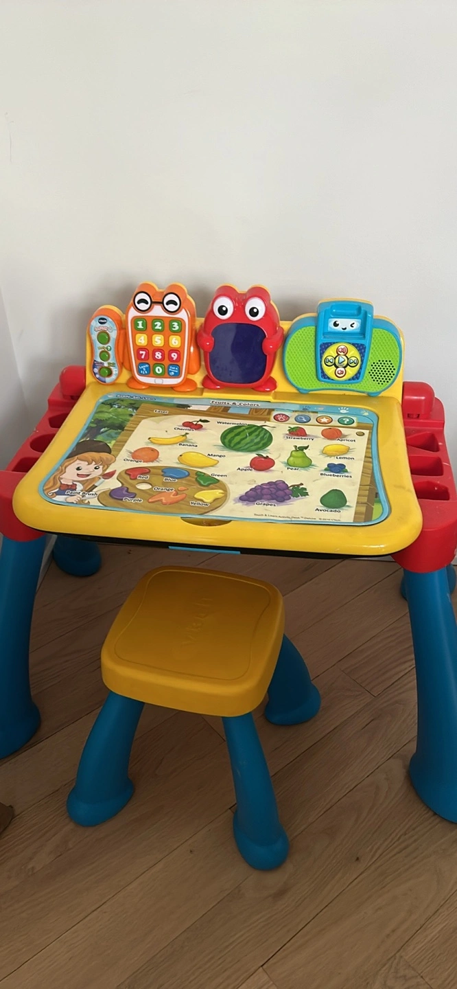 33Interactive learning activity table. Features number pad, musical instrument, and fruit/color learning sections. Includes a matching chair.