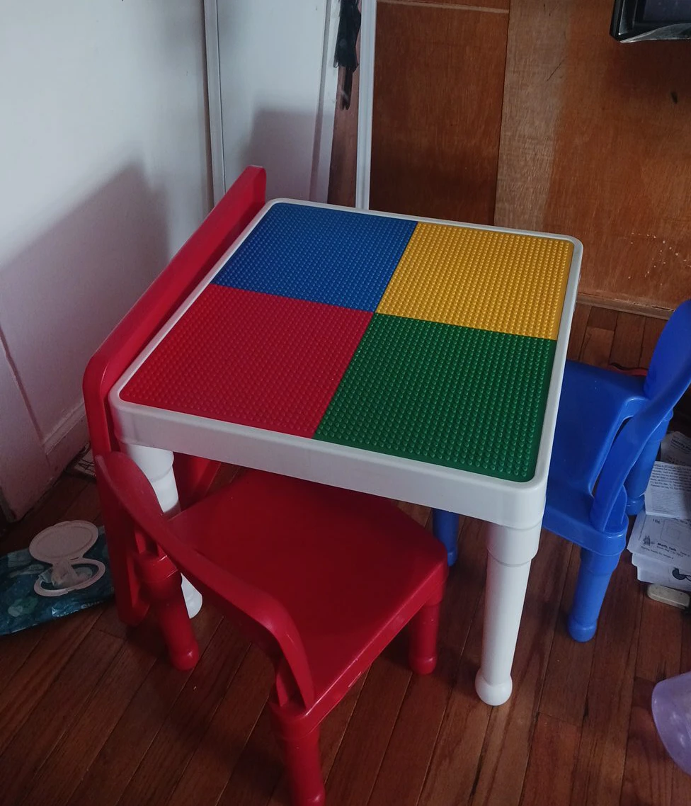 10Kids table with a Lego compatible top! Comes with two chairs. The table top has four colors: blue, yellow, red, and green