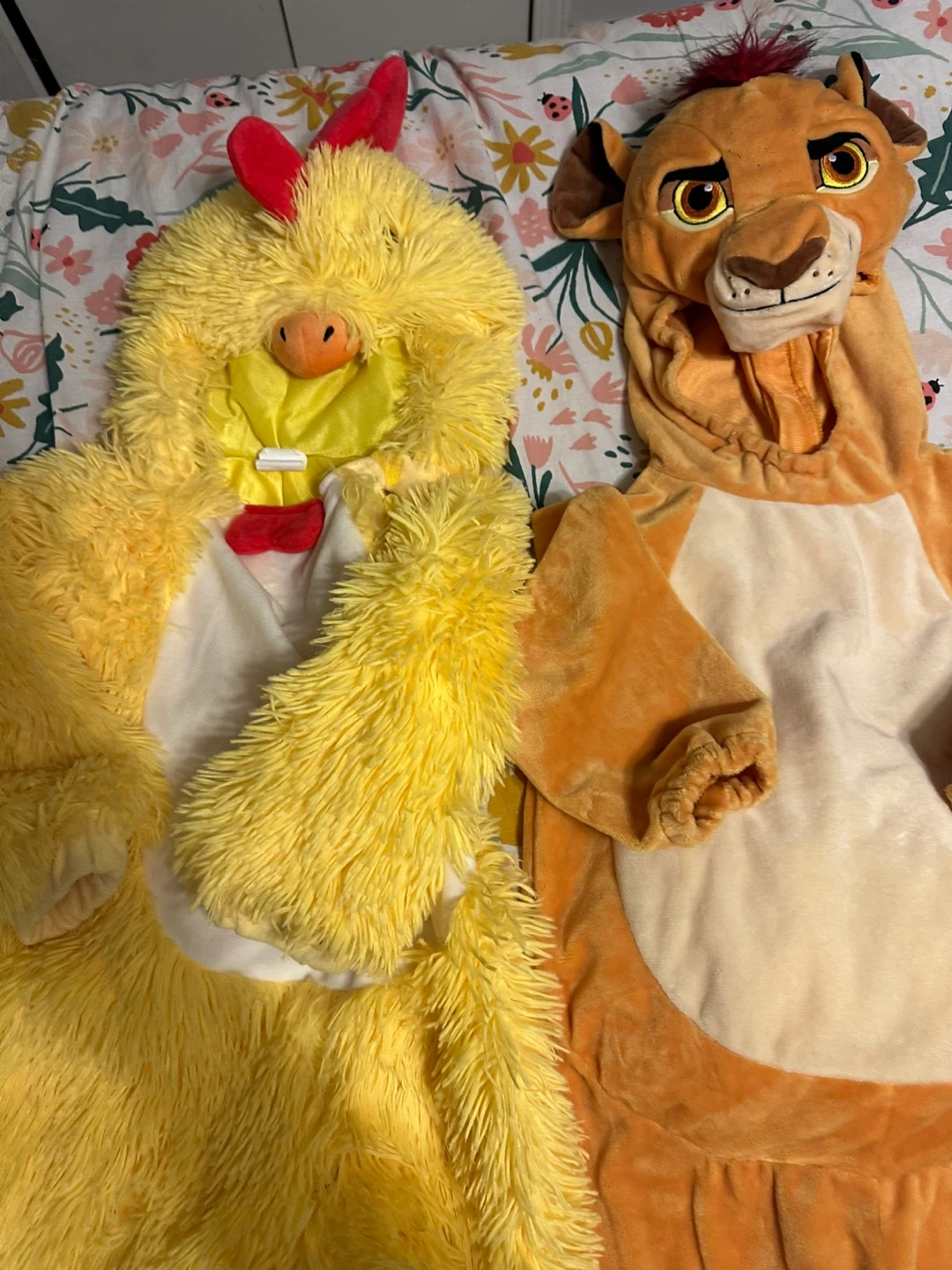 25Selling two adorable kids' costumes! One is a Lion King costume, and the other is a fluffy yellow chicken costume. Both are in great condition and ready for dress-up fun or a costume party