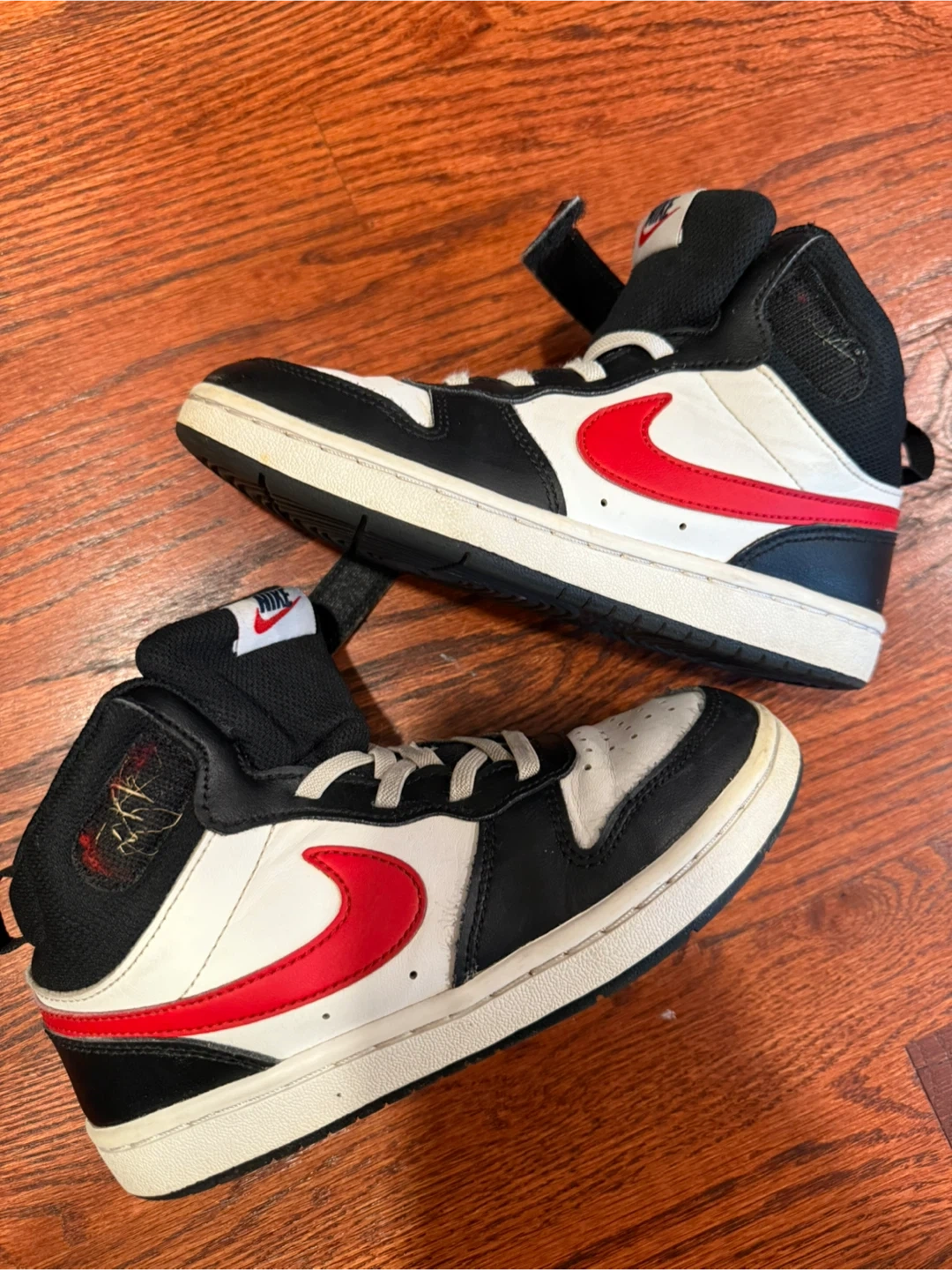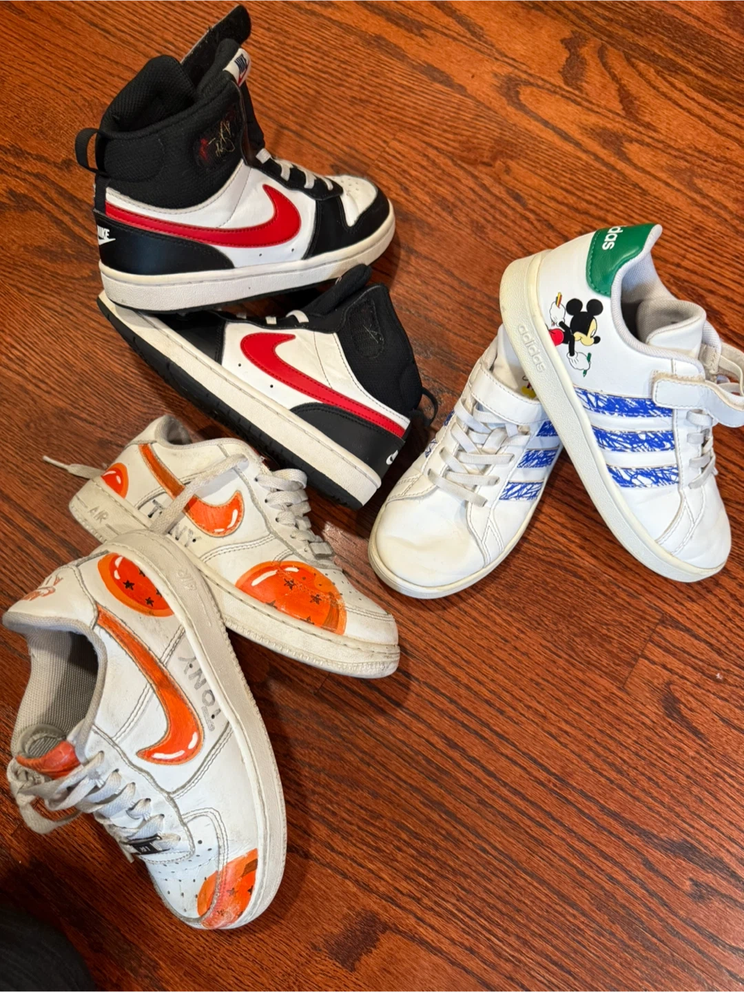 Selling a bundle of kids' shoes. Includes a pair of Nike high tops (black, white, and red), a pair of custom painted Nike Air Force 1s (white and orange), and a pair of Adidas sneakers (white and blue). All shoes show signs of wear.