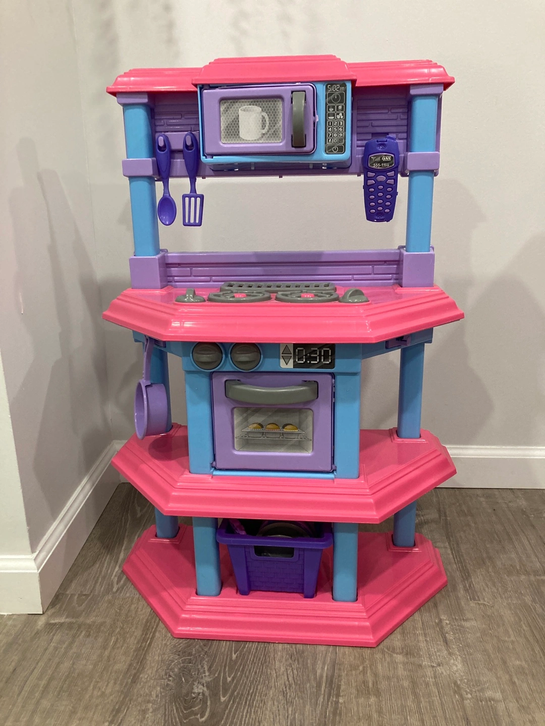 10Selling a cute pink and purple toy kitchen! It features a microwave, oven, stovetop, and even a little phone. Perfect for imaginative play and keeping your little one entertained