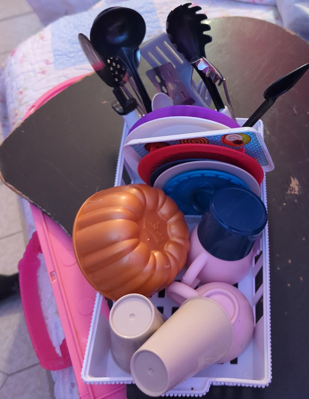 A cute collection of play kitchen dishes and utensils for your little chef! Includes plates, cups, cooking tools, and even a fun pumpkin-shaped mold. Perfect for hours of imaginative play