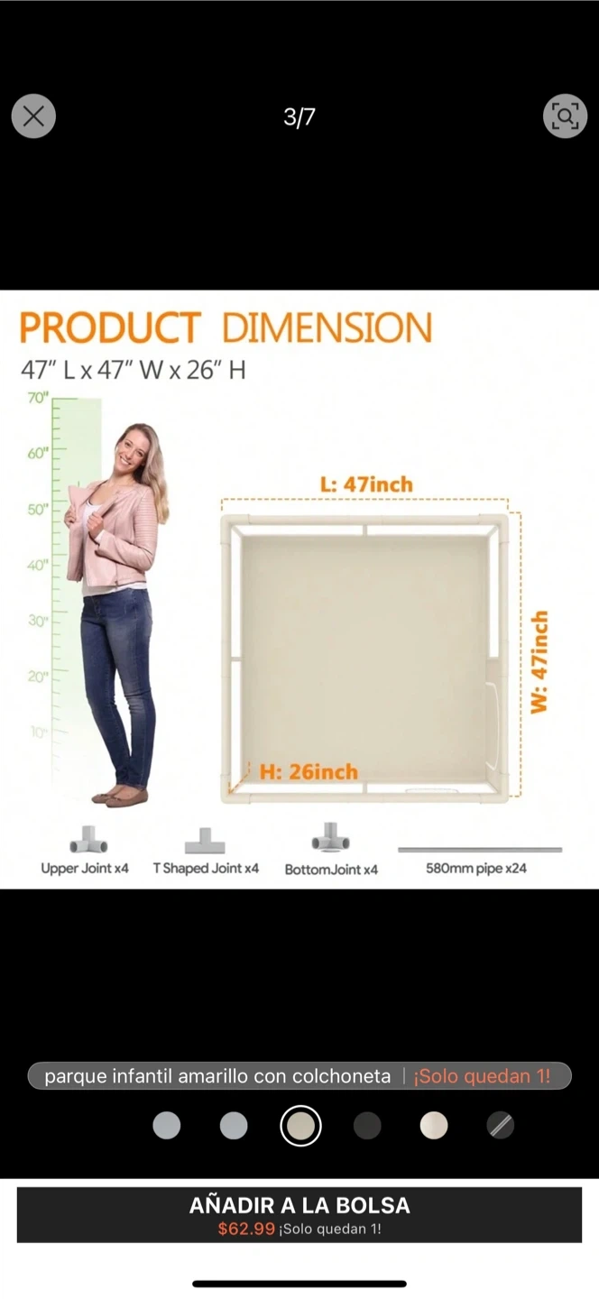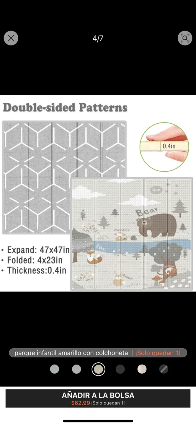 Selling a kids playpen that comes with a mat! The playpen dimensions are 47" L x 47" W x 26" H. The mat has double-sided patterns and is 47x47 inches when expanded. The thickness of the mat is 0.4 inches